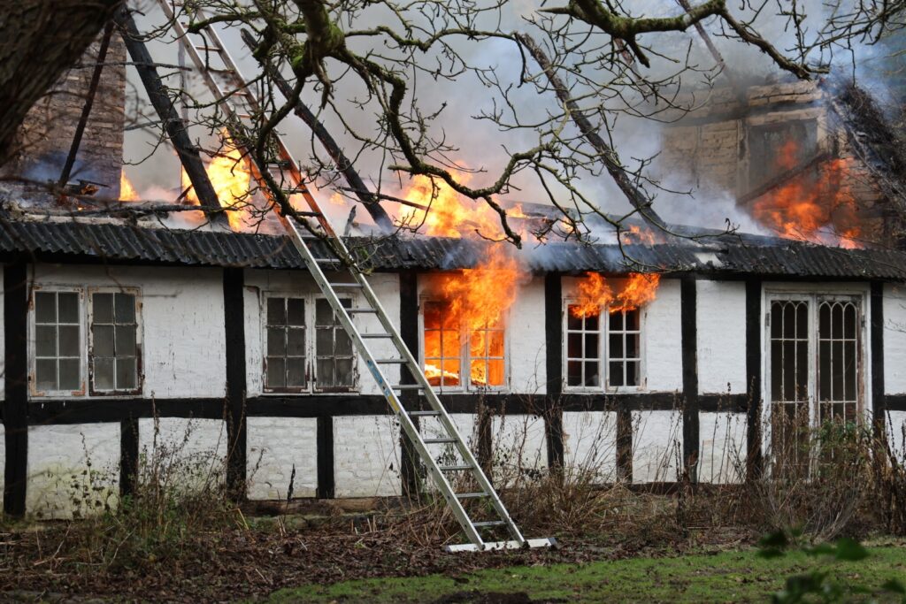 En landejendom står mandag ved middagstid fuldstændig opslugt af flammer.