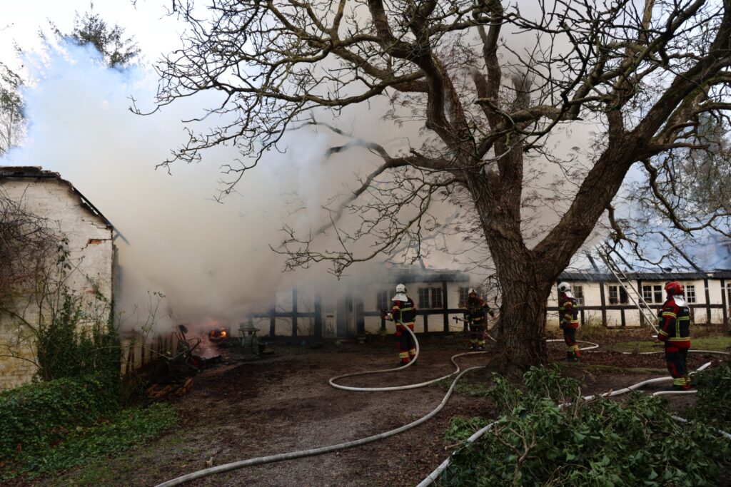Mandag formiddag har store flammer fået fat på en landejendom. Slukningsarbejdet er i gang, men skulle være vanskeligt, og derfor er det forventningen, at ejendommen brænder helt ned. Både mennesker og dyr var inde i huset, da branden opstod.