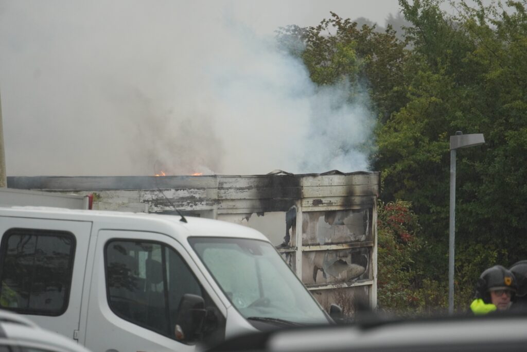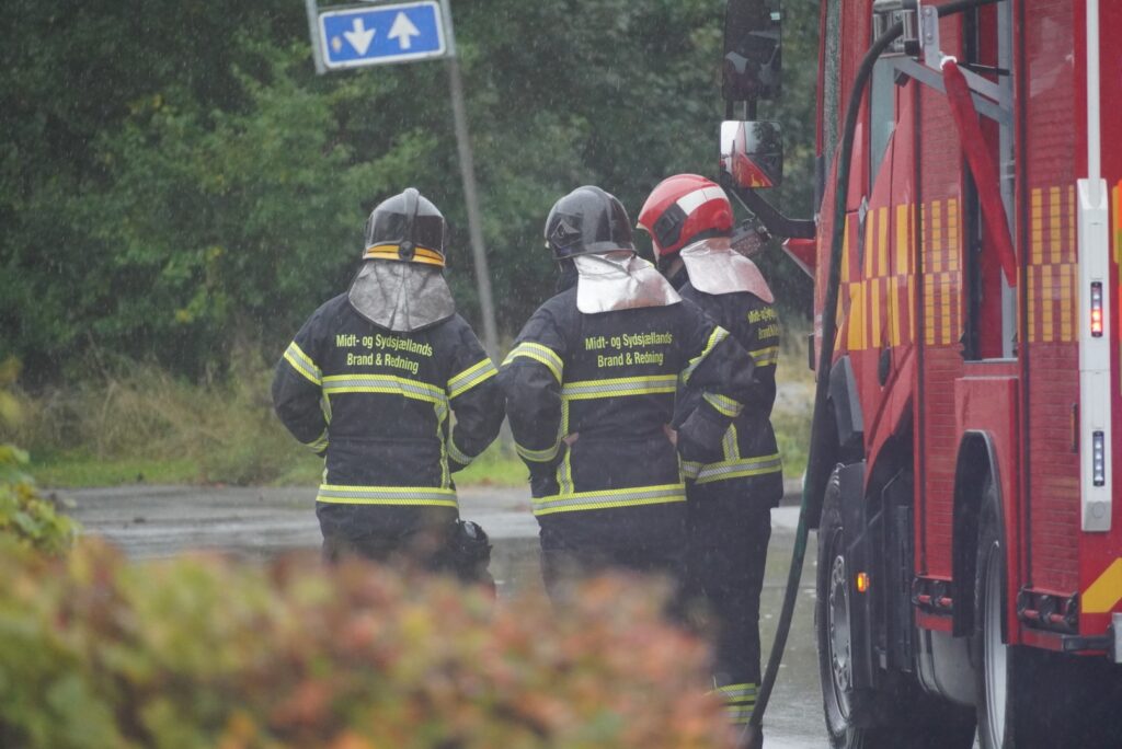 Her er brandvæsenet nu i færd med at få kontrol over situationen, mens regnen siler ned.