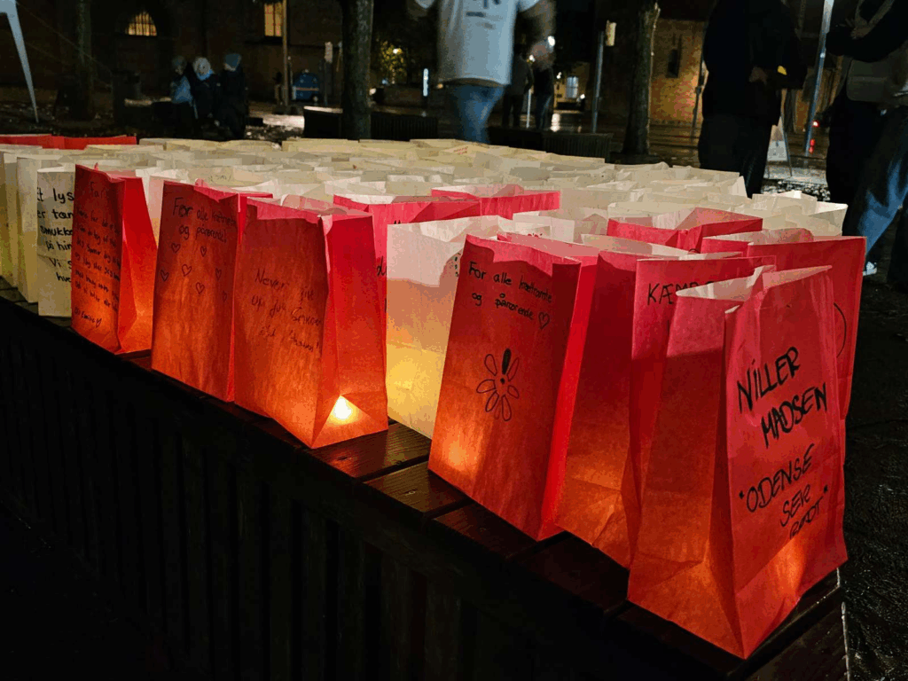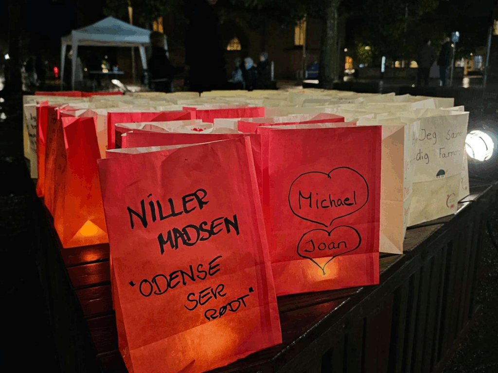 På Platanpladsen over for Odense Domkirke var mange mødt op for at tænde et lys for familiemedlemmer, kolleger og venner.