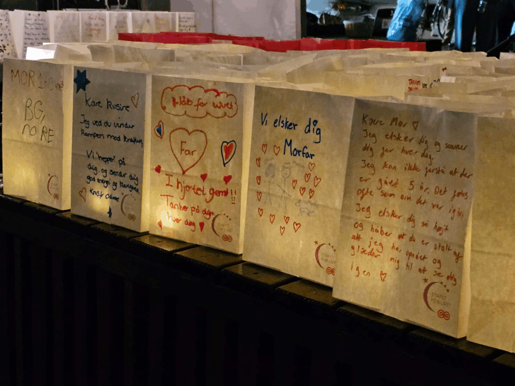 Lysposerne lyste Platanpladsen i Odense op i mørket som et symbol på den fælles kamp mod kræften og et minde om dem, sygdommen har taget fra os.