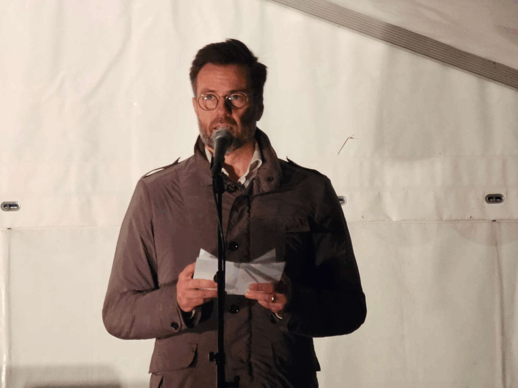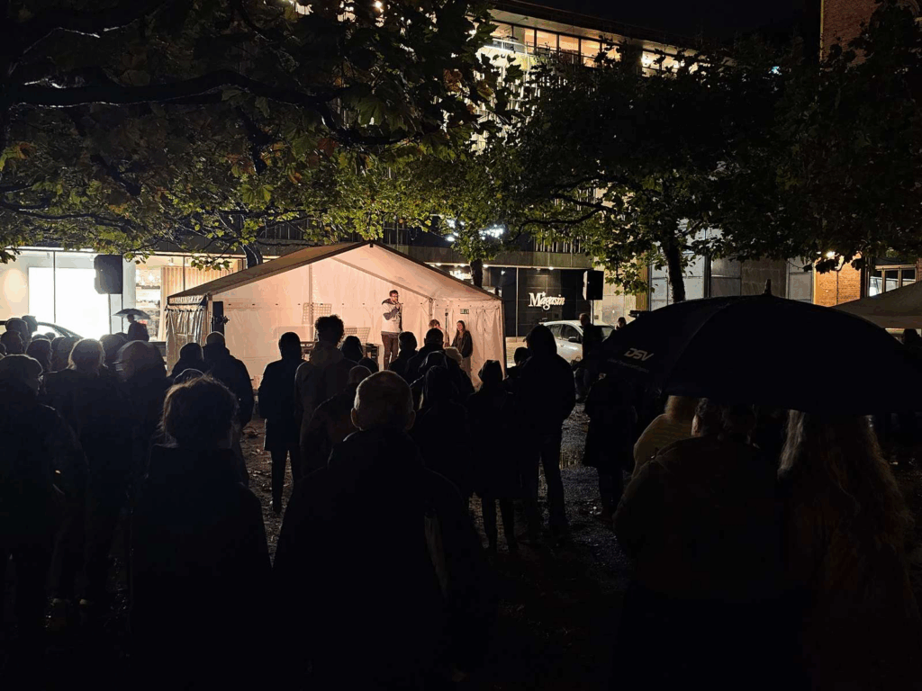 Mens de deltagende tegnede og skrev på lysposerne, tonede flere talere og performere frem på scenen.