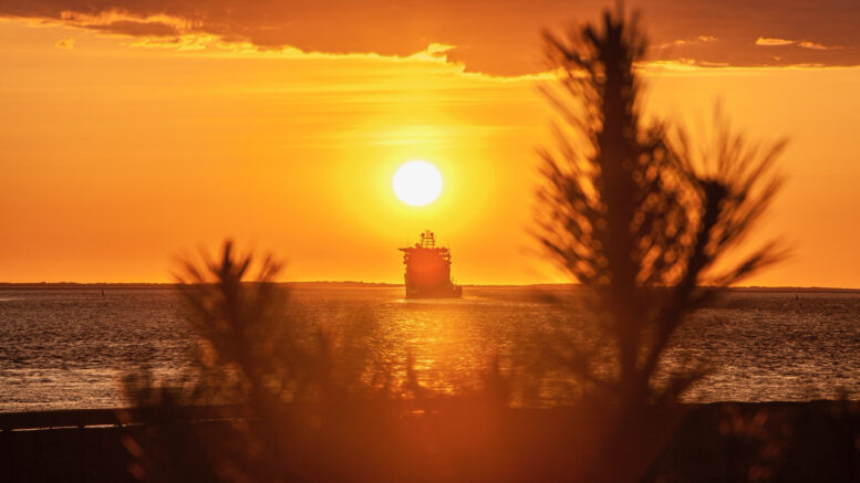 Solnedgang over Esbjerg havn – en legesyg sæl i vandet