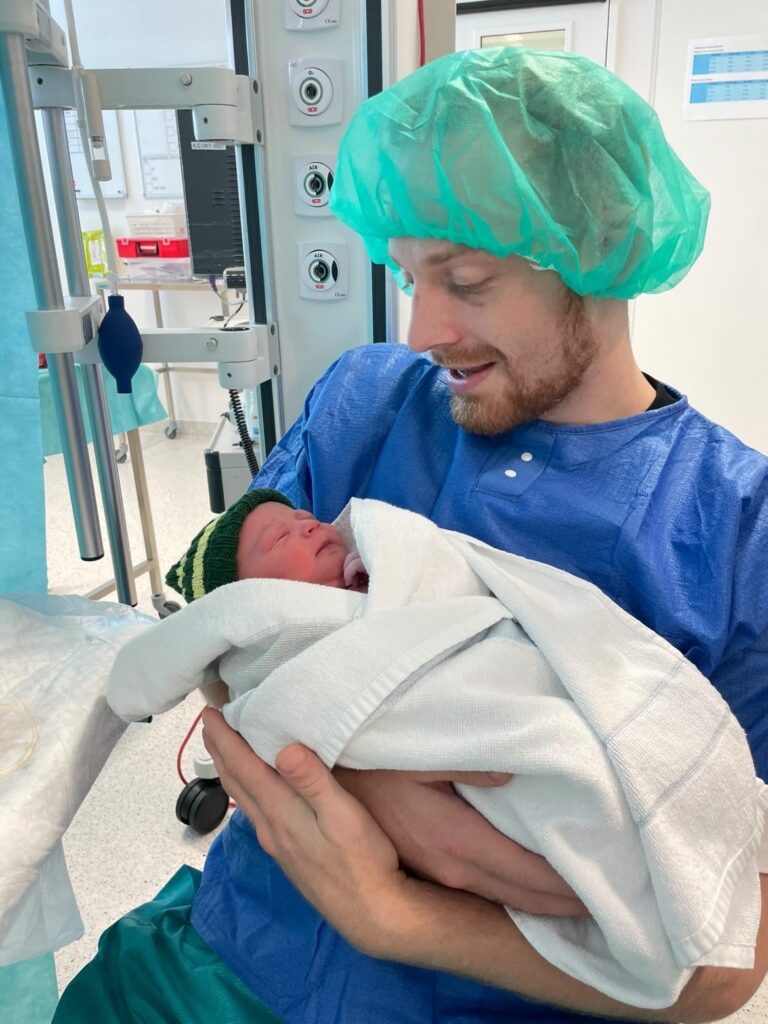 Nu skal han i første omgang holde om sin nyfødte søn, og så kan træningen mod det næste mål fortsætte.