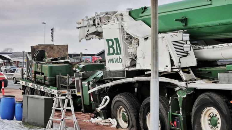 Kranlastbil og lastbil i voldsomt sammenstød: Det fosser ud