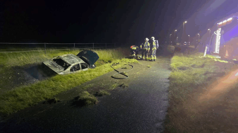 Bil kører i grøft og bryder i brand