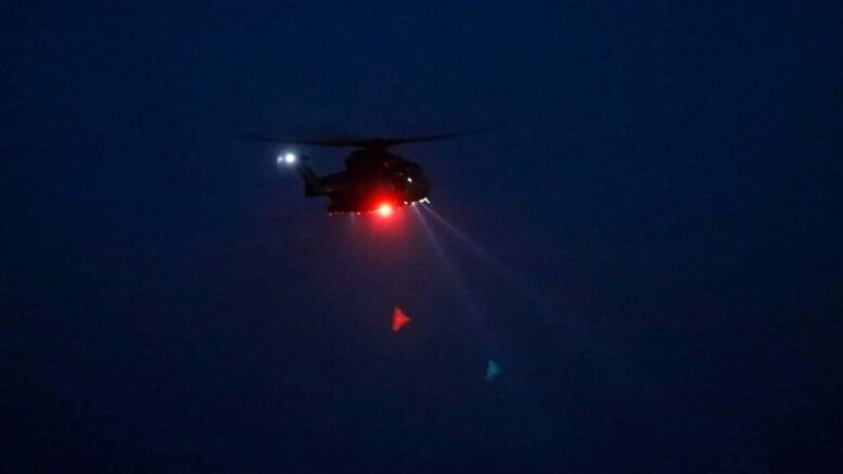 Forsvarets helikopter hænger over området: Nødblus set over havet