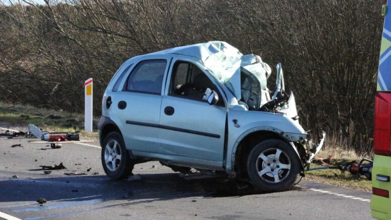 Kørte ud foran en lastbil: Fronten af bilen blev skrællet af