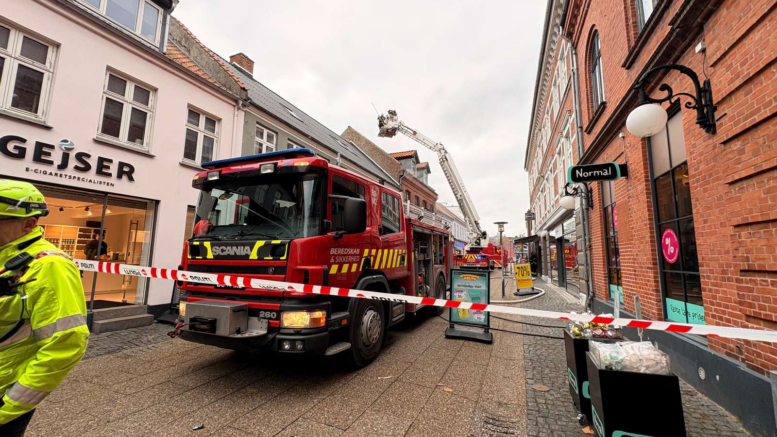 Kraftig udrykning og afspærring midt i byen: ‘Brand i tøjlager’
