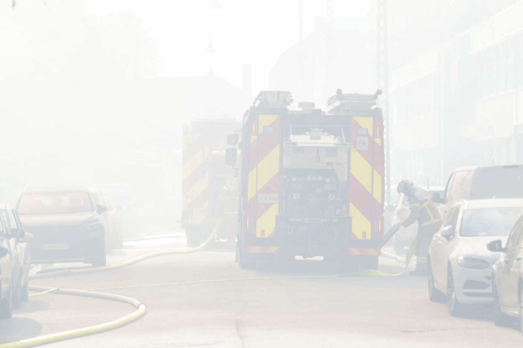 På stedet er vejen spærret, mens brandfolkene knokler med branden, hvorfra en stor, sort røgsky stiger til vejrs.