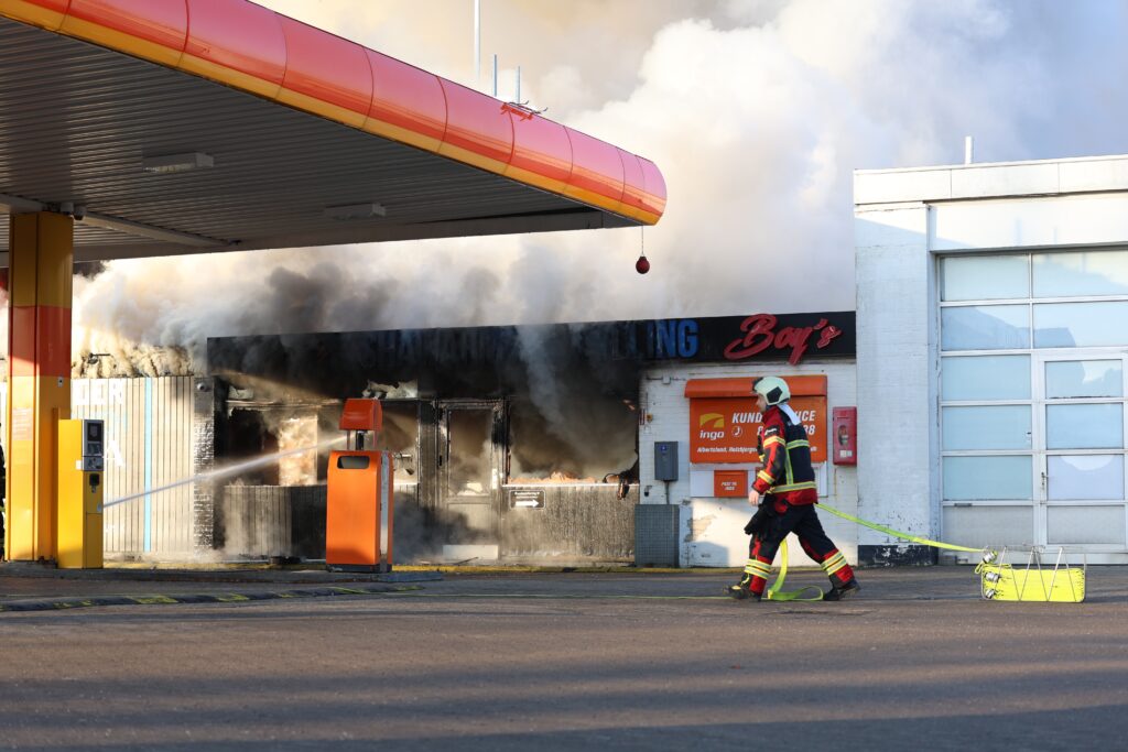 En bygning på en tankstation er netop brudt ud i brand