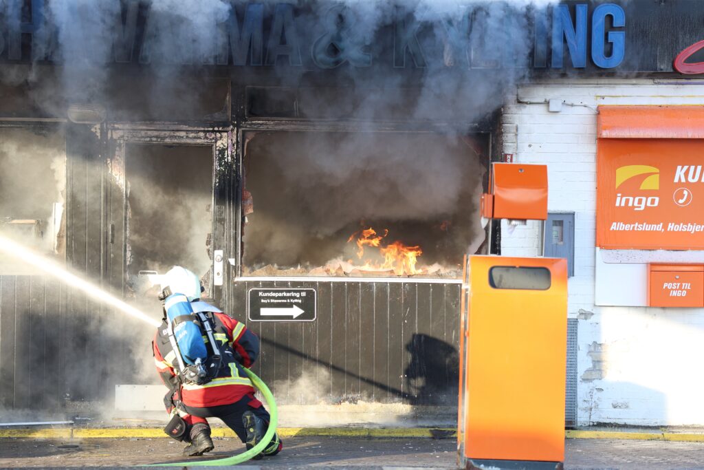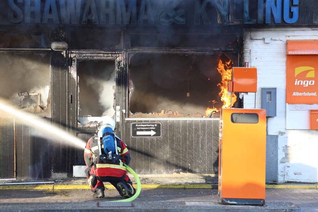På billederne fra Presse-fotos.dks udsendte kan man se, at det er sharwarmabaren ‘Boys’, hvor branden lige nu raserer. Sort røg står ud af bygningens vinduer.