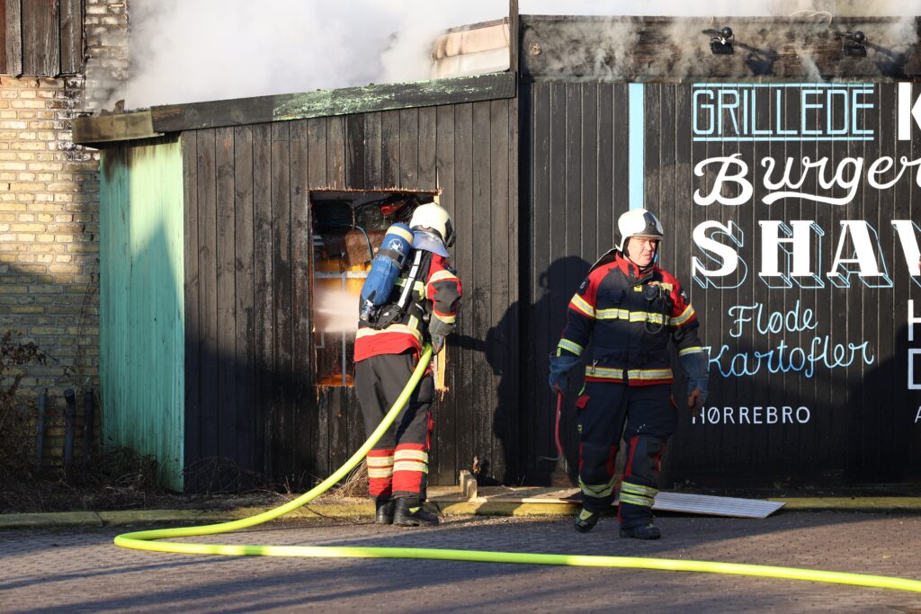 Brandvæsnet er til stede og i gang med at få slukket branden på sharwarmabaren.