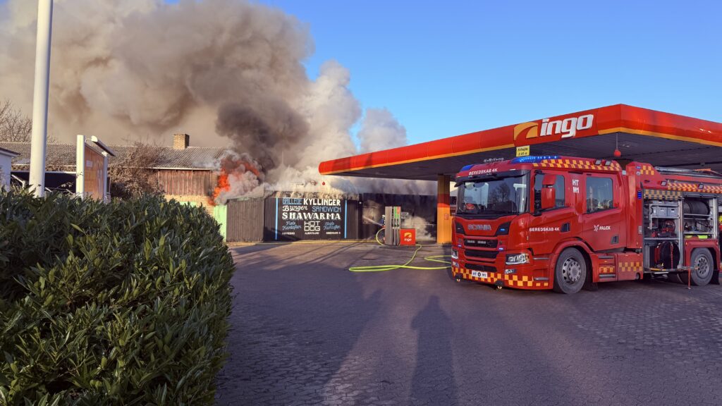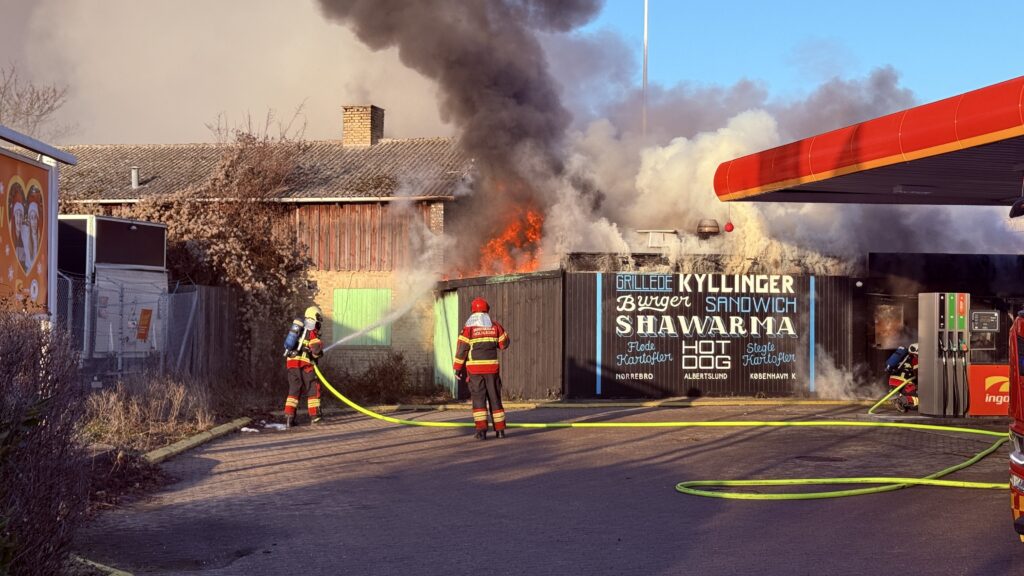 Der er på Ingo-tankstationen på Holsbjergvej 35 i Albertslund er der en massiv bygningsbrand igen netop nu.