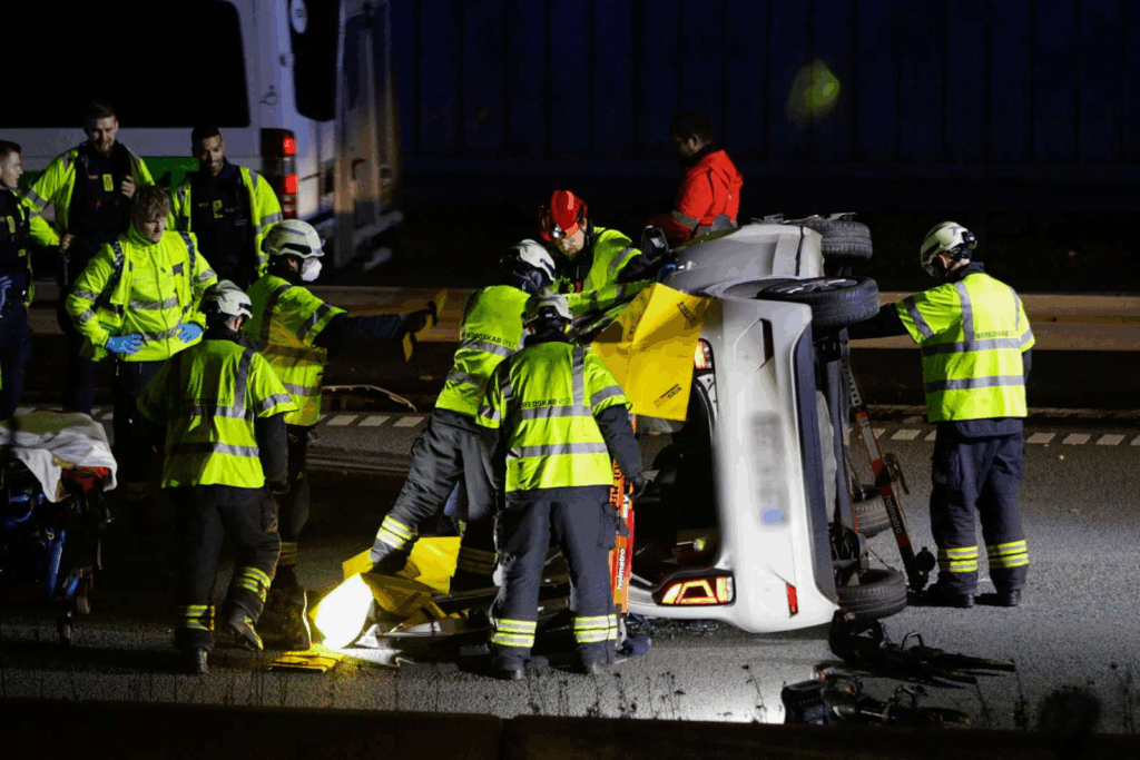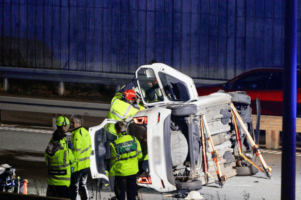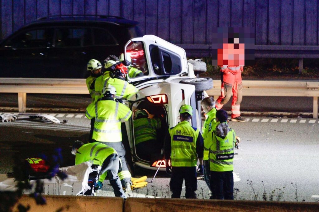 Billeder fra stedet viser, at en personbil ligger på siden midt på vejbanen.