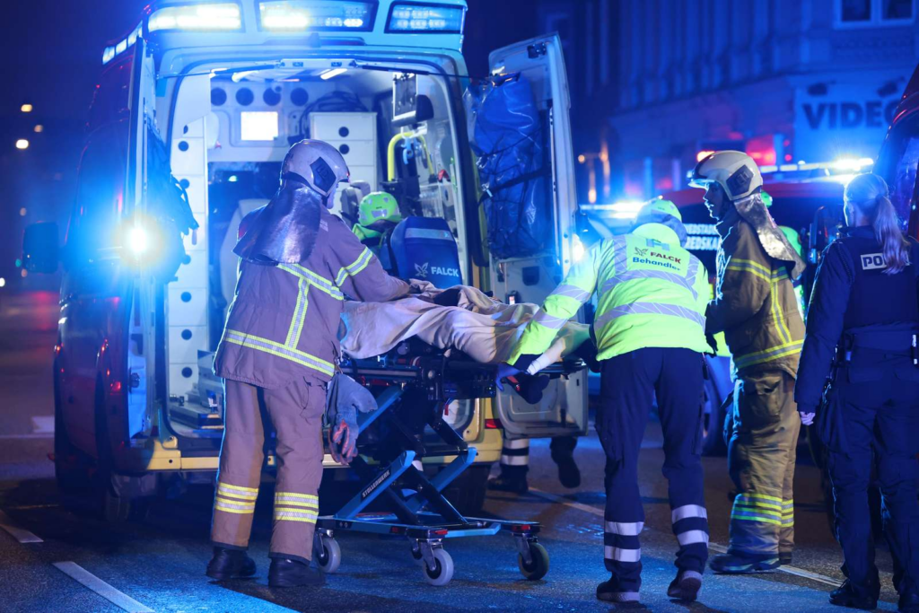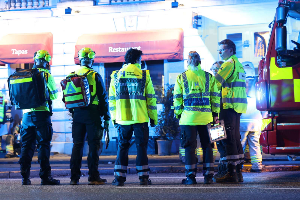 “To personer er blevet båret ud i kritisk tilstand. En af dem er kørt afsted i ambulance, og reddere udøver lige nu hjertelungeredning til den anden i en ambulance, der holder her.”