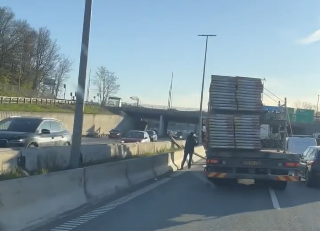 En lastbil har tabt stillads midt på motorvejen.