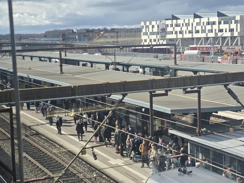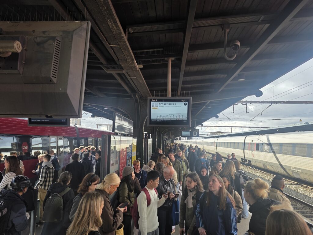 Mange mennesker står fredag eftermiddag på stationen, der er et knudepunkt for togtrafikken.