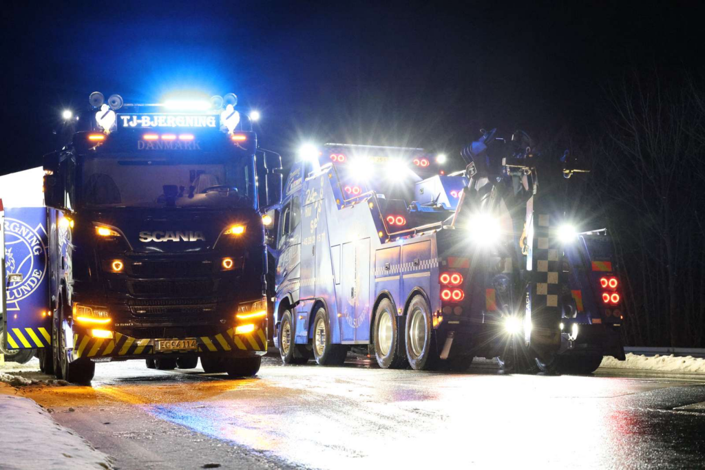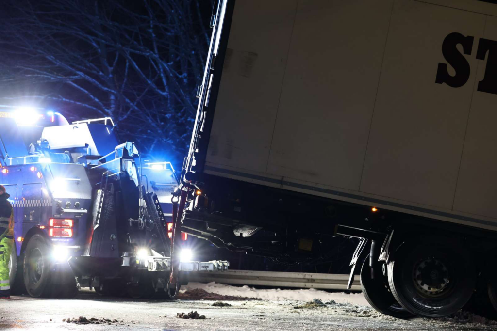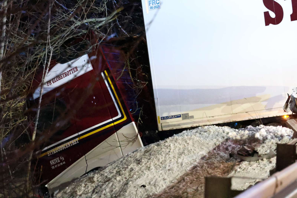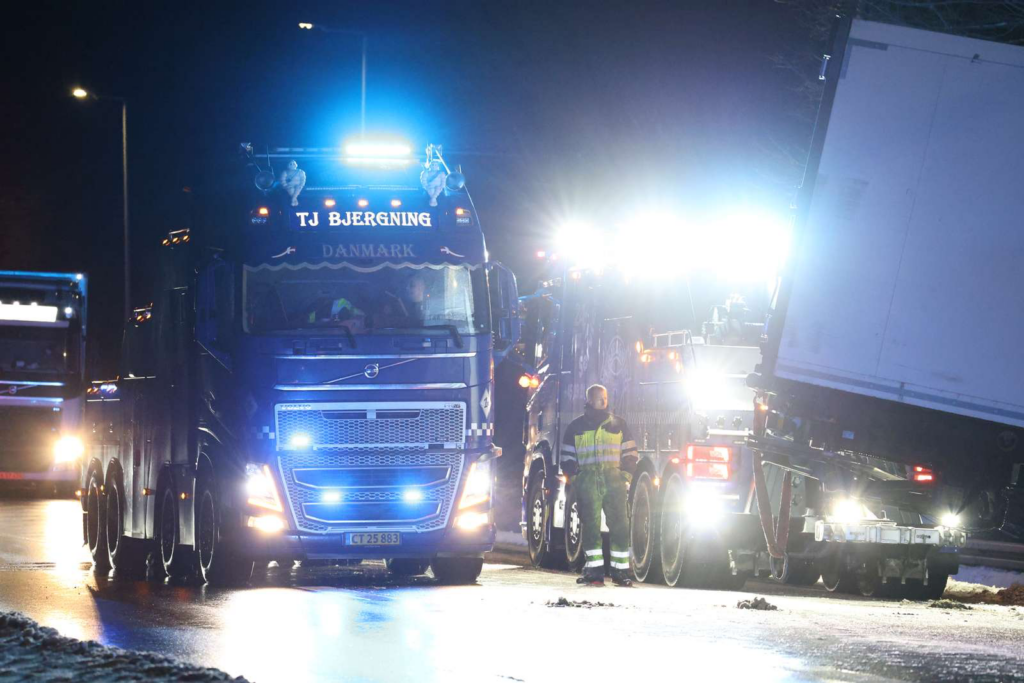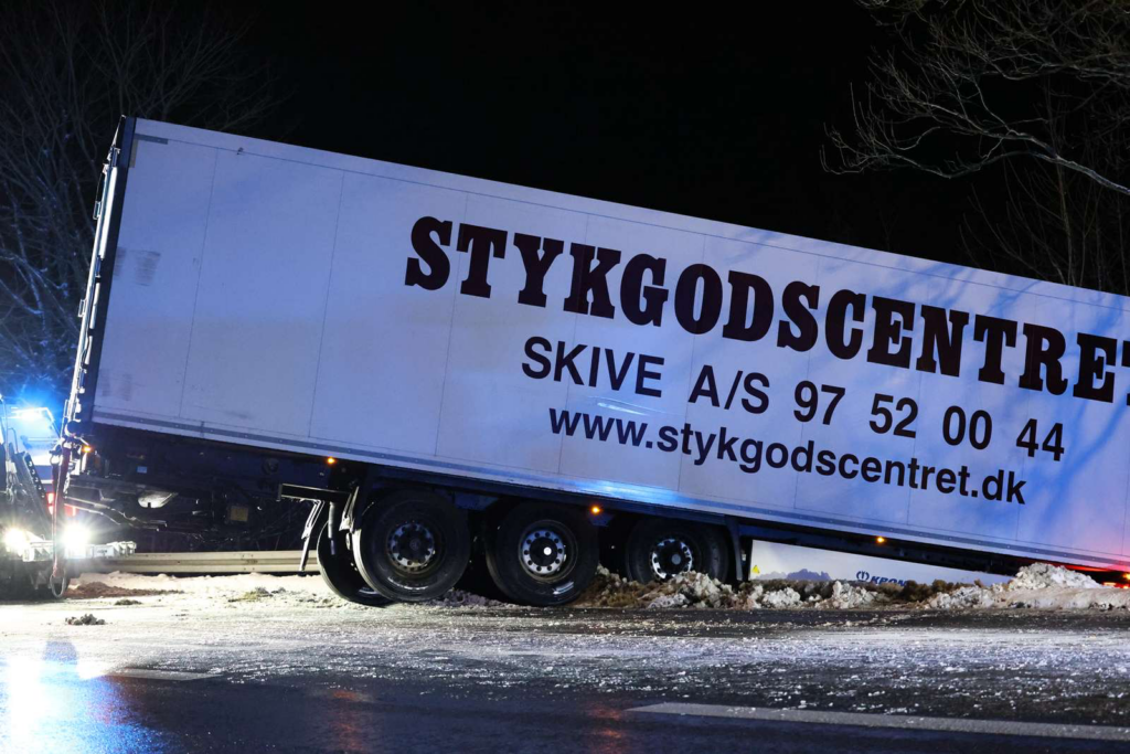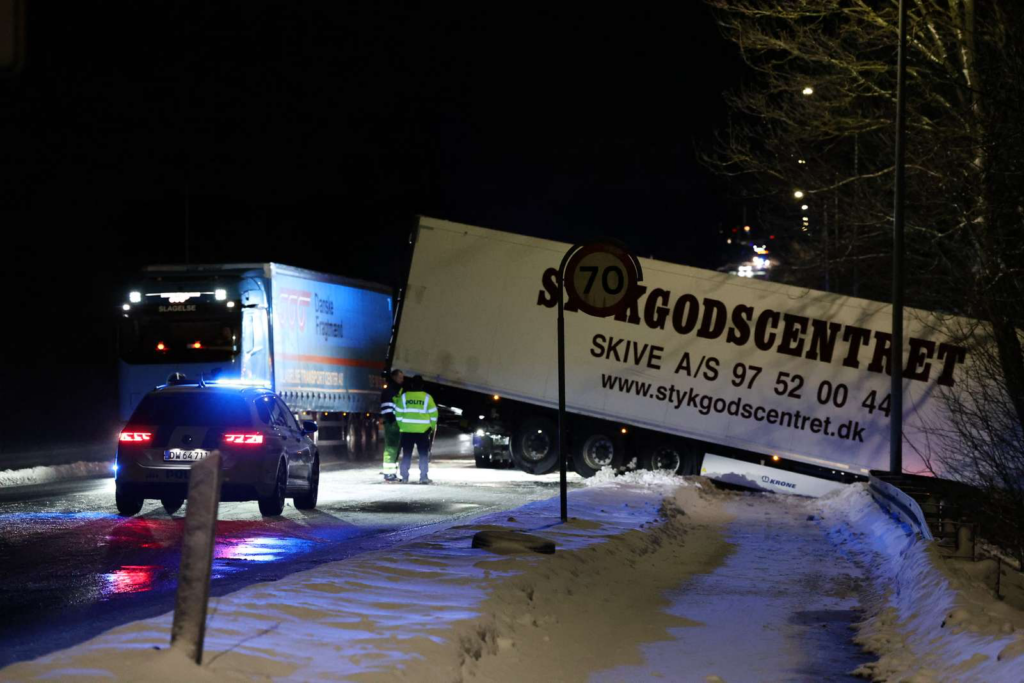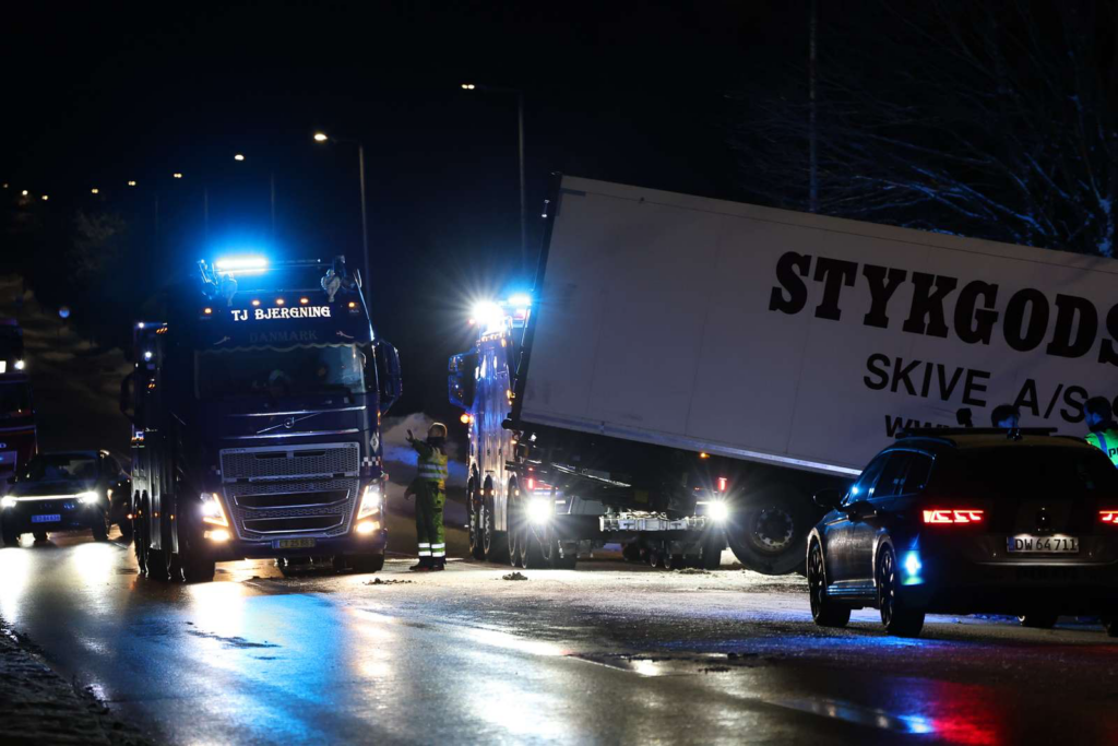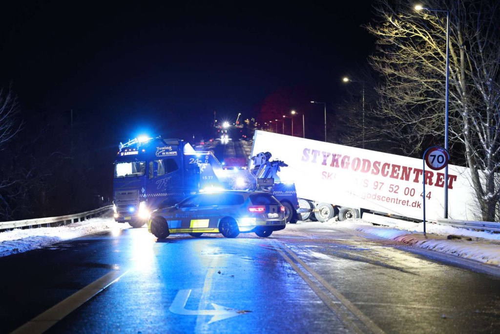 Billeder fra stedet viser, at lastbilens forende ligger langt nede i grøften, mens bagenden spærrer tværs over kørebanen.