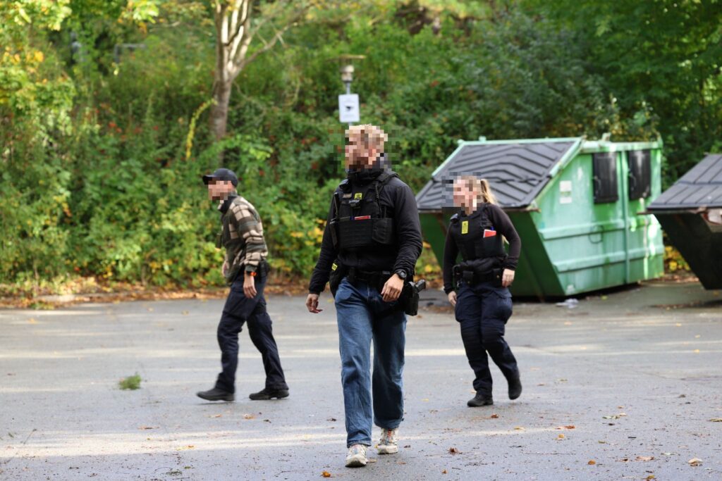 “I dette øjeblik kører en patruljebil forbi mig. Der sidder en person, der er blevet anholdt, i en hvid DNA-dragt på bagsædet,” lyder det fra redaktionens udsendte på stedet.