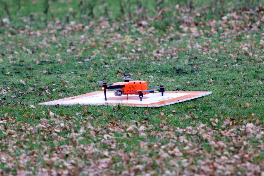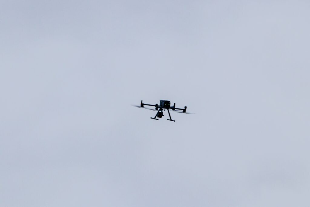 Området er afspærret, mens der arbejdes på stedet, hvilket indebærer undersøgelser med en drone.