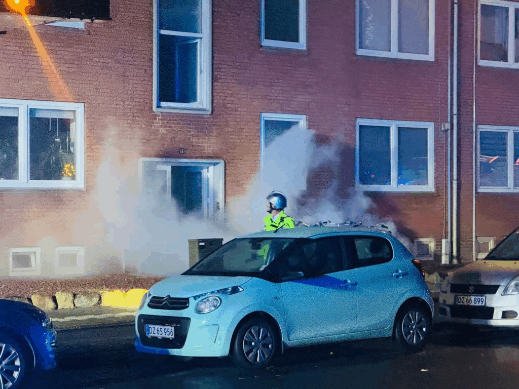 Ifølge Presse-fotos.dk’s fotograf på stedet stod røgen tæt og væltede ud fra kældervinduerne, da de første brandfolk ankom.