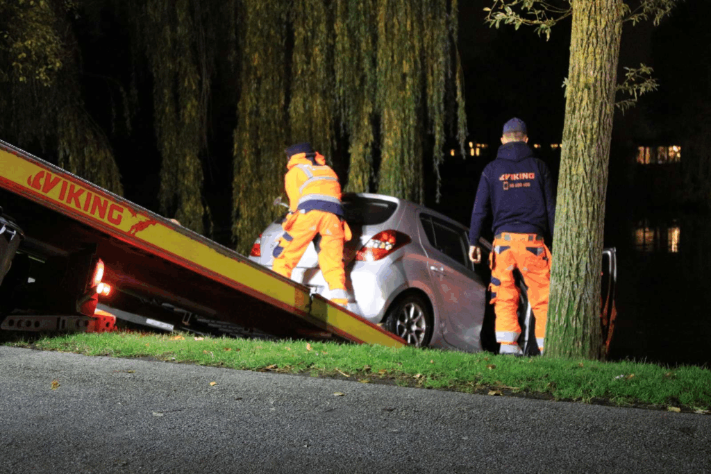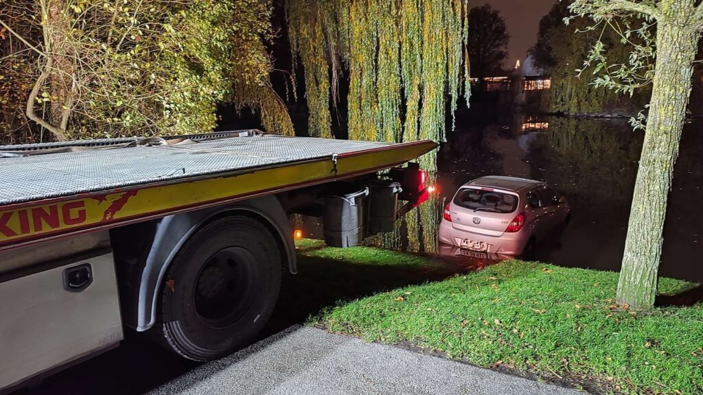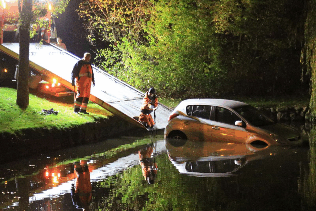 Vejhjælp er ved 20-tiden ankommet og er i færd med at trække bilen op fra vandet.