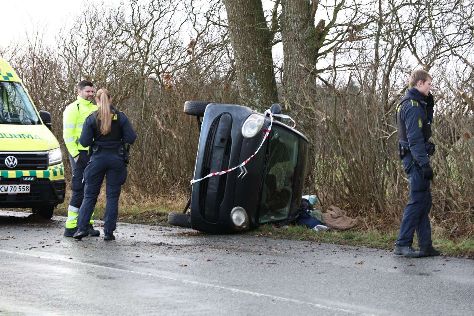 Uheldet skete på en mindre vej, hvor bilen i forbindelse med et solouheld væltede om på siden.