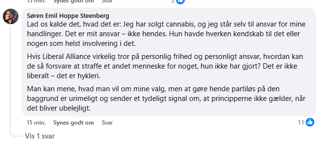 ‘Hvis Liberal Alliance virkelig tror på personlig frihed og personligt ansvar, hvordan kan de så forsvare at straffe et andet menneske for noget, hun ikke har gjort? Det er ikke liberalt – det er hykleri’, skriver han.