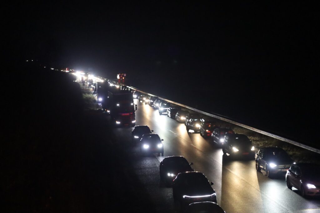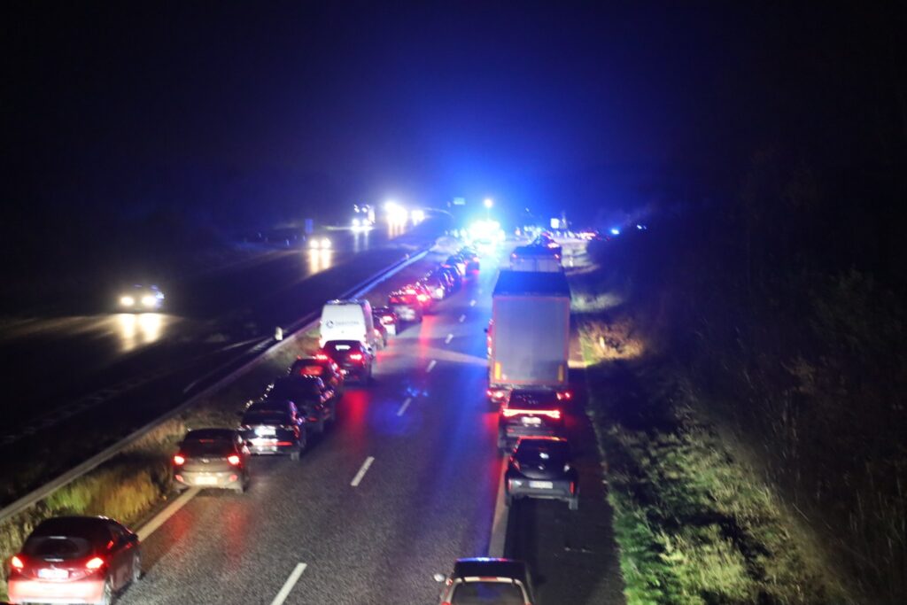 ‘Motorvejen er helt spærret i nordlig retning. Det er forsat muligt at køre af, og køre ad hovedvejen. Følg anvisninger på stedet og vis hensyn, så alle kan komme sikkert frem,’ skriver politikredsen.