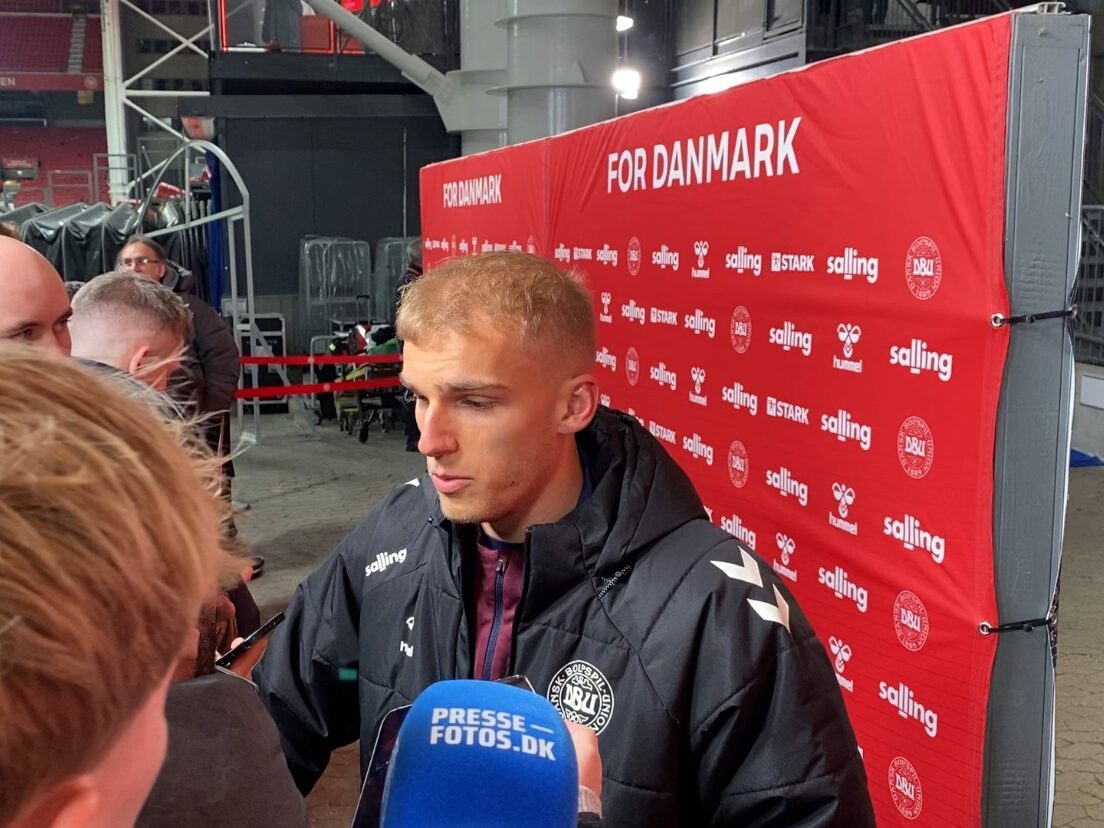 En lettet Gustav Isaksen mødte pressen, efter at Danmark vandt 4-0 over Nordmakedonien torsdag.