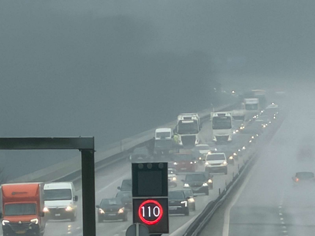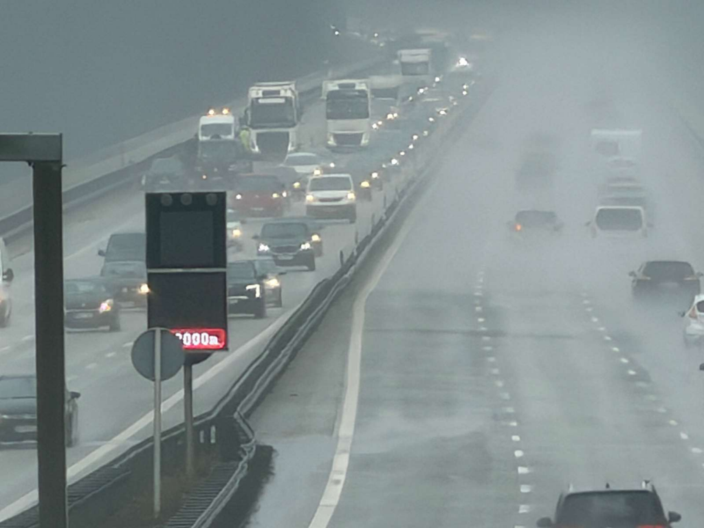 Årsagen er akut vejarbejde, som er sat i gang i sydgående retning. Arbejdet har skabt markante trafikale udfordringer, og køen vokser i takt med, at flere rammer strækningen.