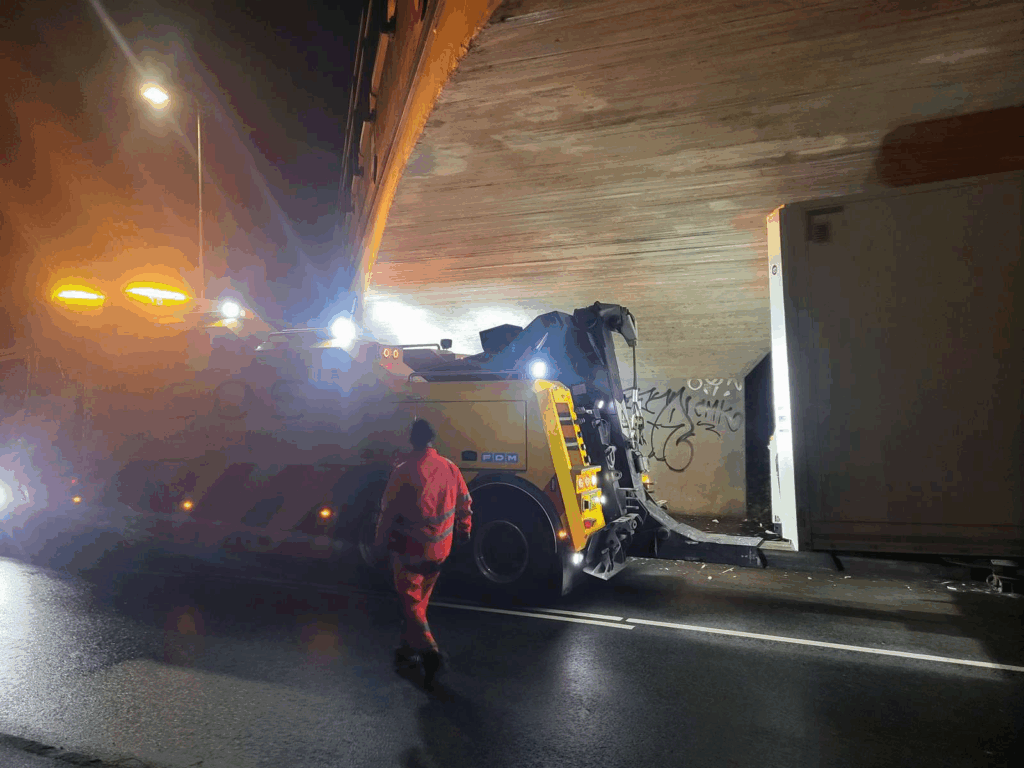 Sammenstødet var så kraftigt, at lastbilen nu sidder fastklemt under broen, og vejen er derfor fuldstændig spærret i begge retninger.