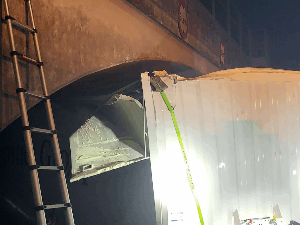 En lastbil er kørt direkte ind i en togbro på Fåborgvej i Svendborg.