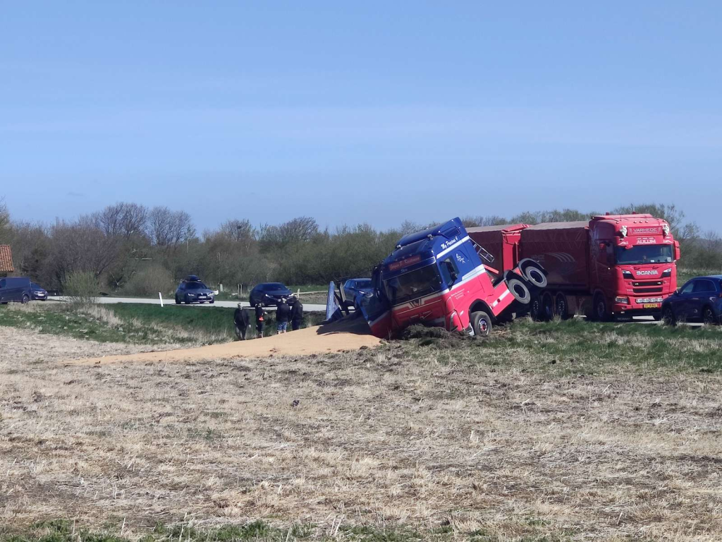 Fredag formiddag endte en lastbil i grøften lidt uden for Holstebro.