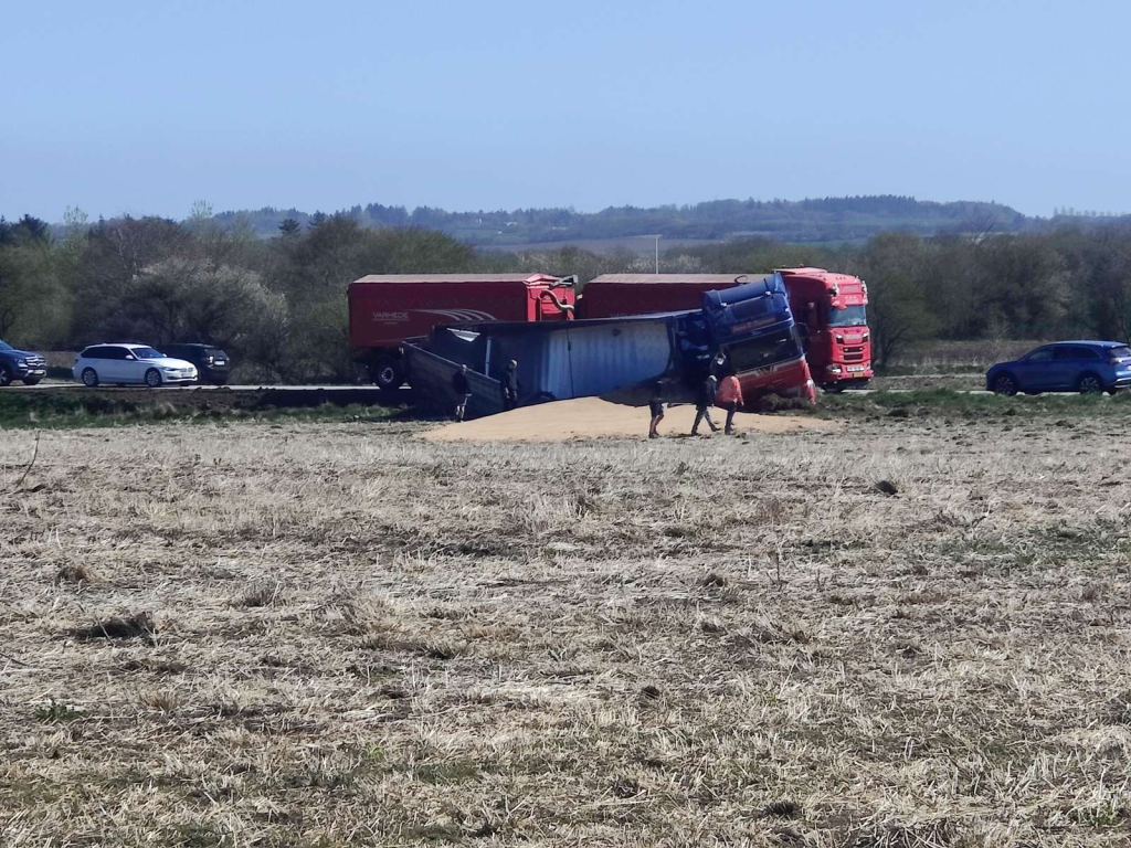 Fredag formiddag resulterede en defekt på forhjulet af en lastbil i, at det store køretøj endte i grøften og tabte indholdet af ladet.