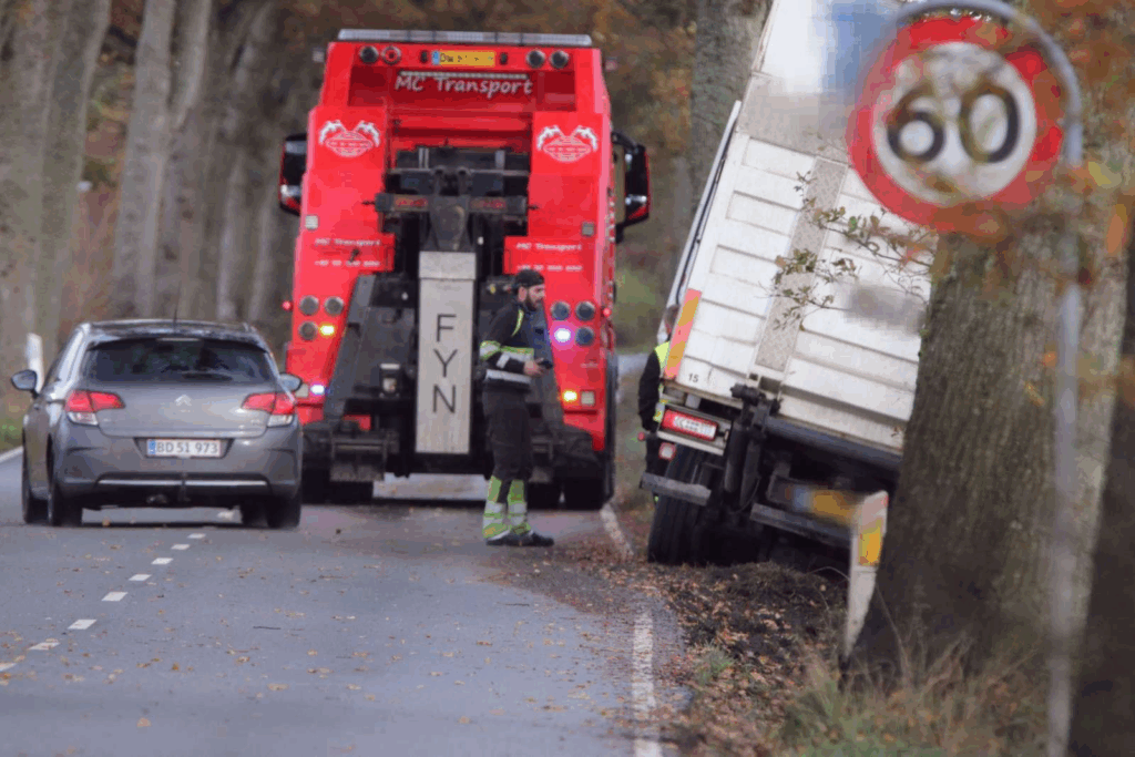 Hændelsen skete på Erholmvej i Aarup i Assens Kommune. Et vogntog fra et autohjælpsfirma er på stedet, og vejen er delvist spærret, mens arbejdet står på.