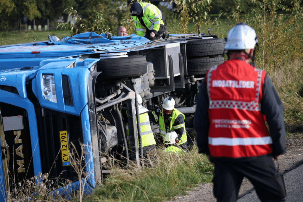 “Brandvæsenet forsøger at finde ud af, hvordan man skal løfte lastbilen op igen. Bjærgningskøretøjer er også herude.”