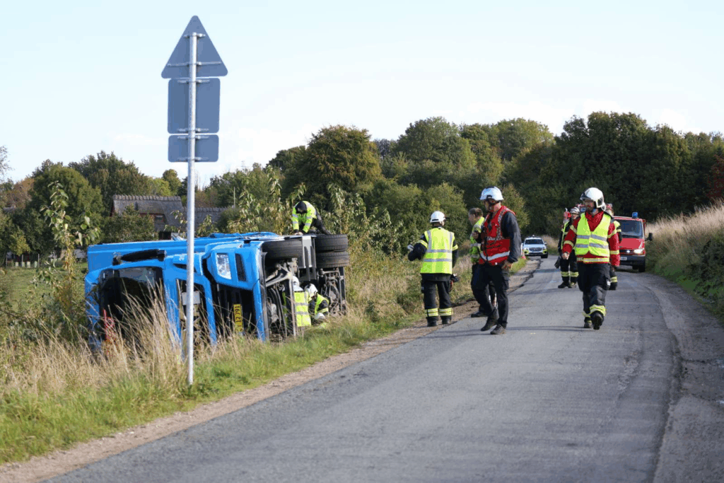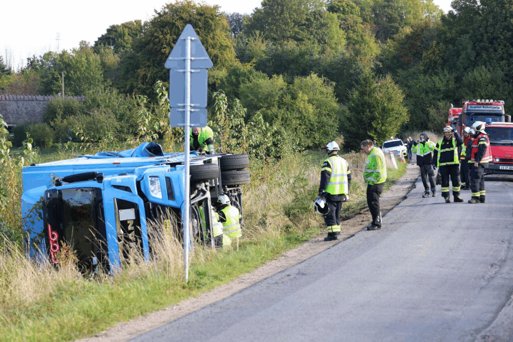 Billeder fra stedet viser i den forbindelse, at redningspersonale kravler rundt på det store køretøj, mens det ligger på siden ved en lille vej.