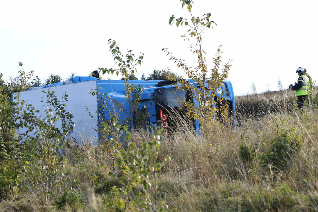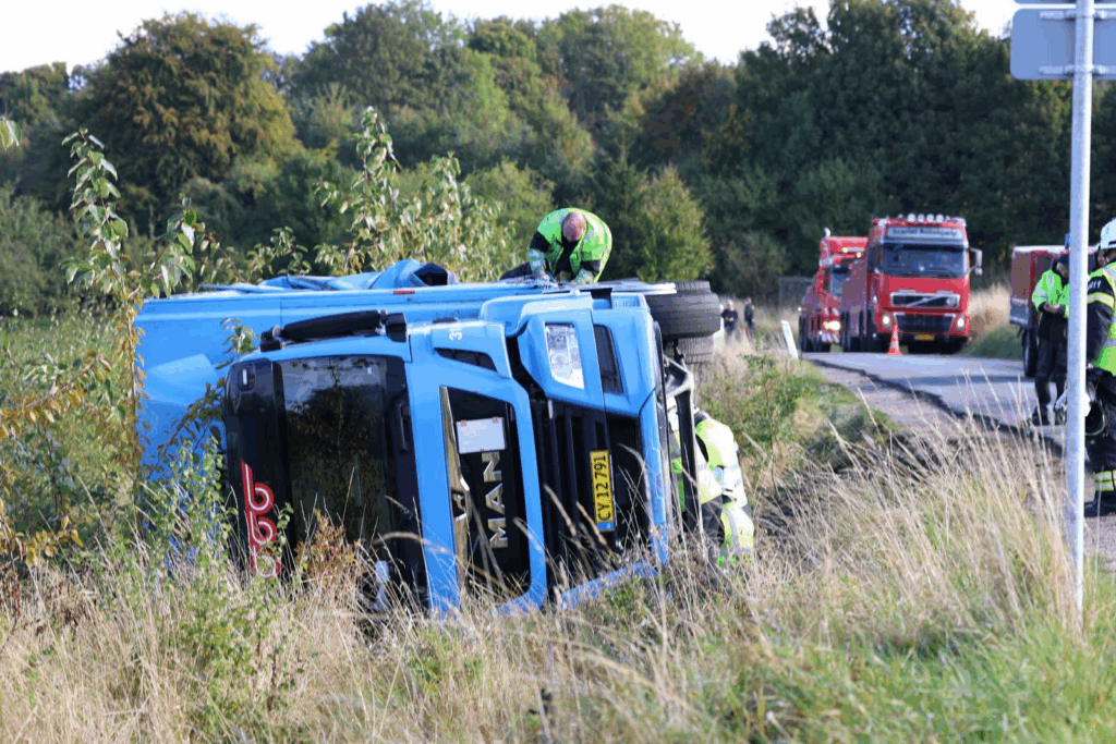 Det er voldsomme billeder, der torsdag middag kommer fra en lille vej, hvor en lastbil har pløjet jord og græs op, før den er skredet ned i en grøft og nu ligger på siden