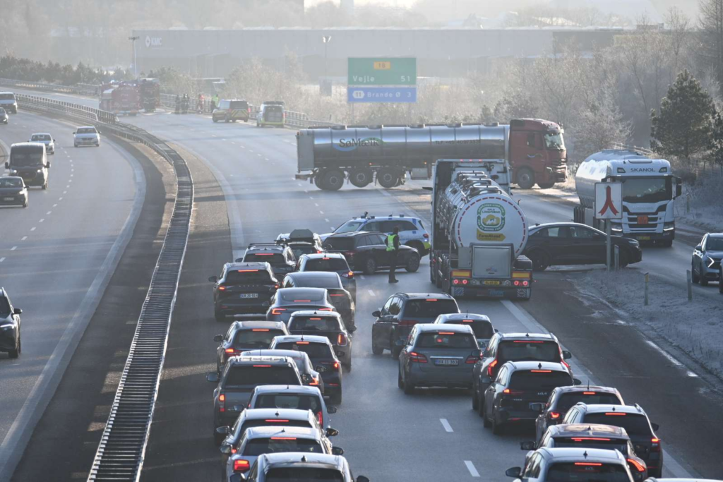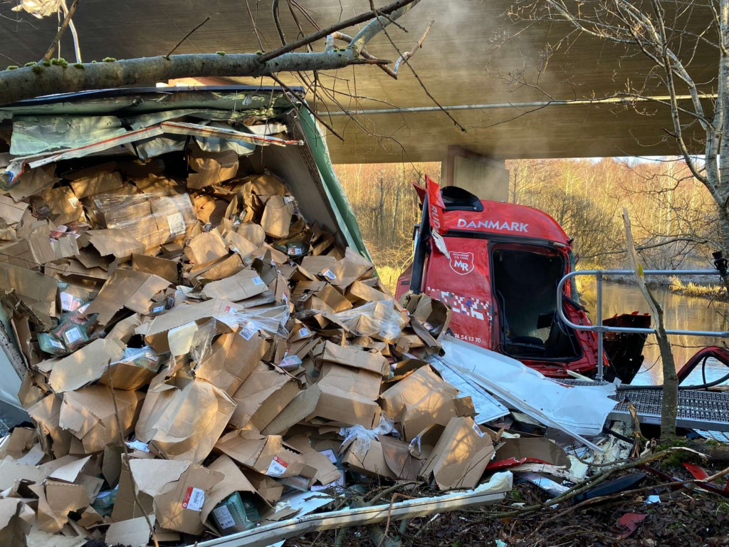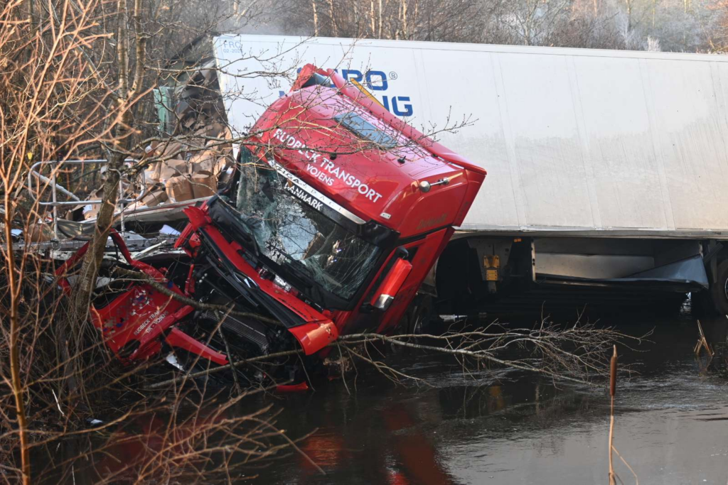 Søndag formiddag udviklede et alvorligt færdselsuheld sig dramatisk på en dansk motorvej, hvor en lastbil endte med at styrte gennem autoværnet og langt ned i terrænet under vejbanen.