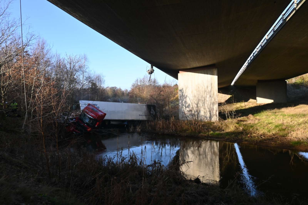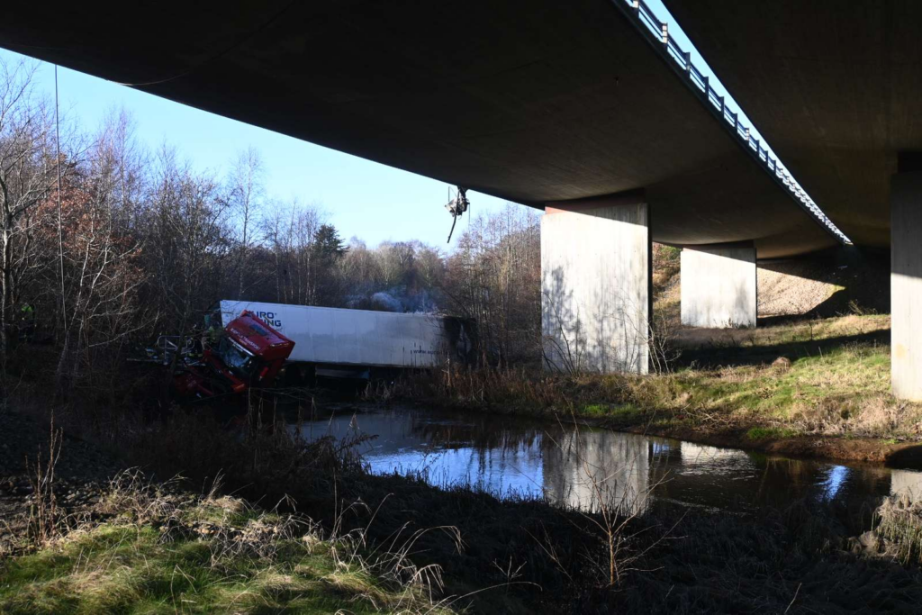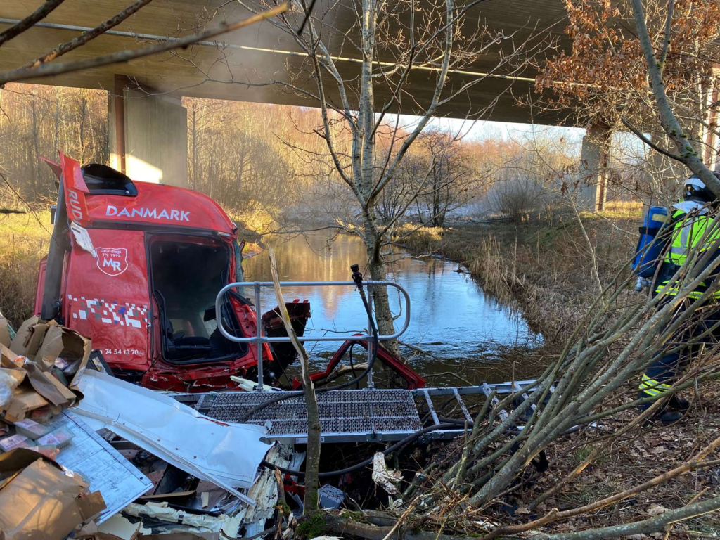 Lastbilen er røget et godt stykke ned fra motorvejen og er landet i åen
