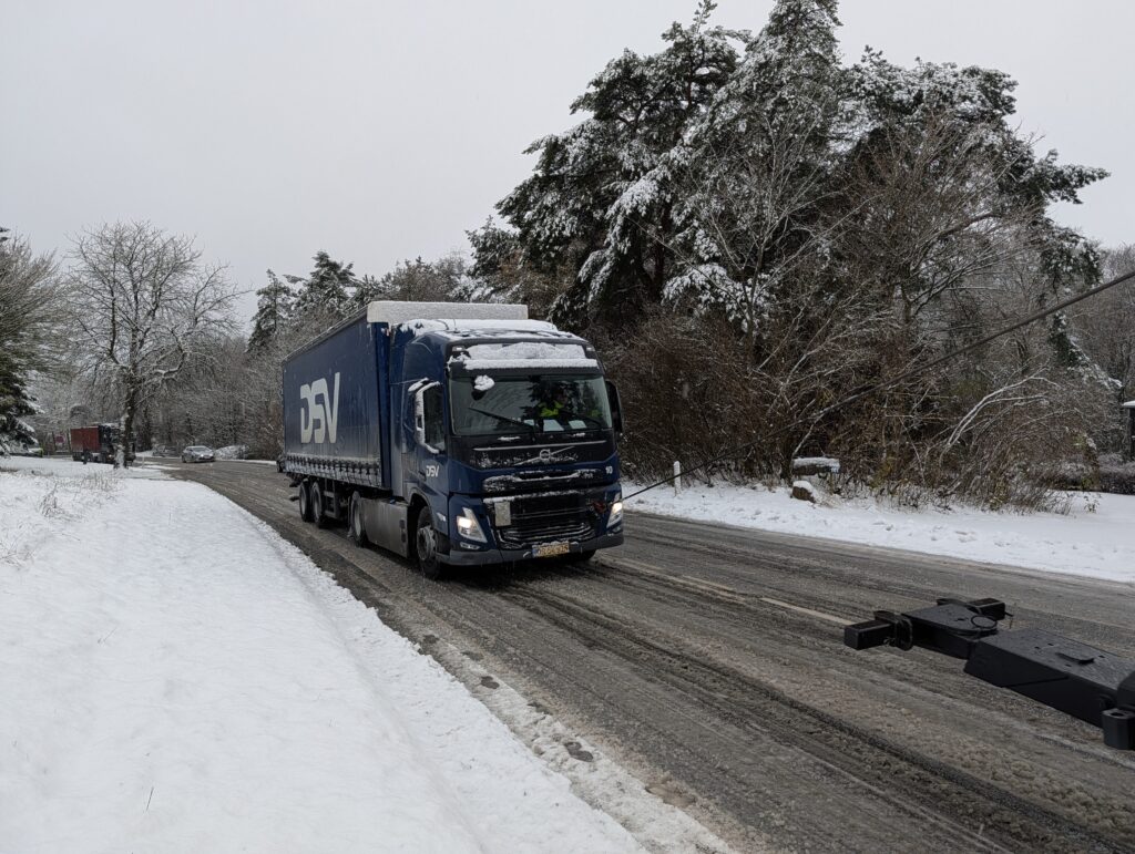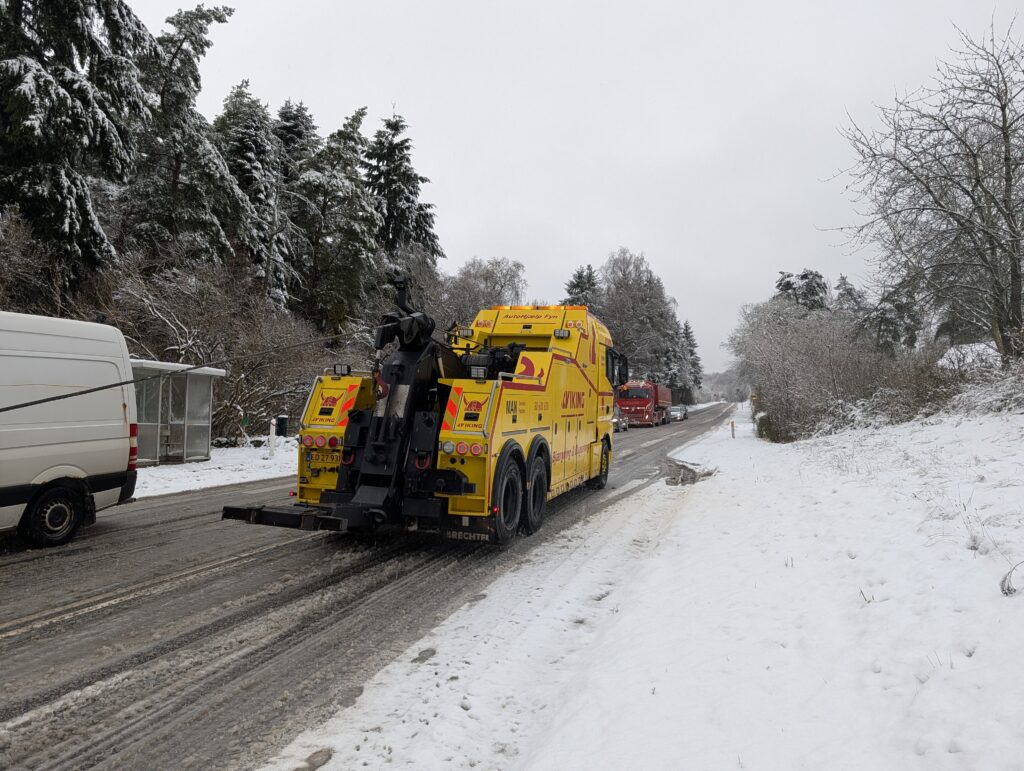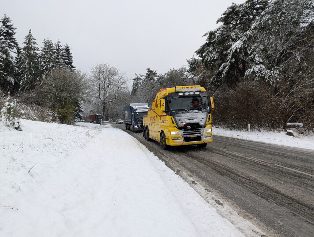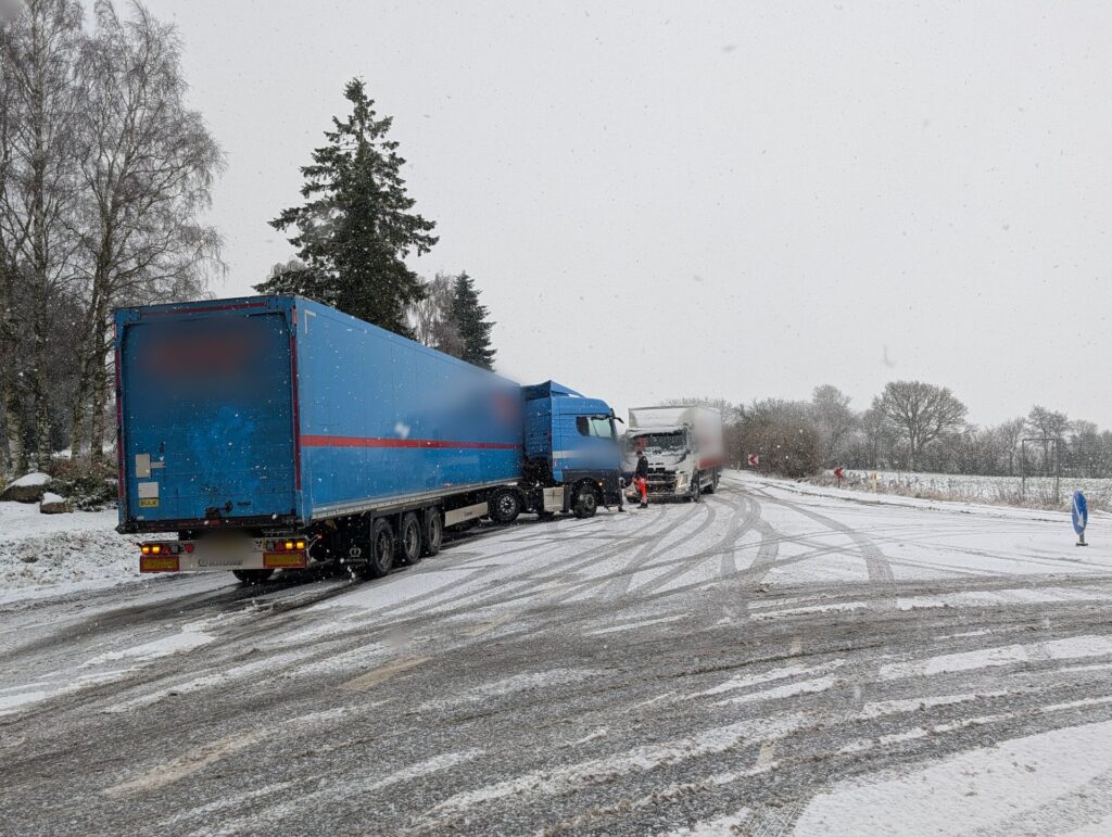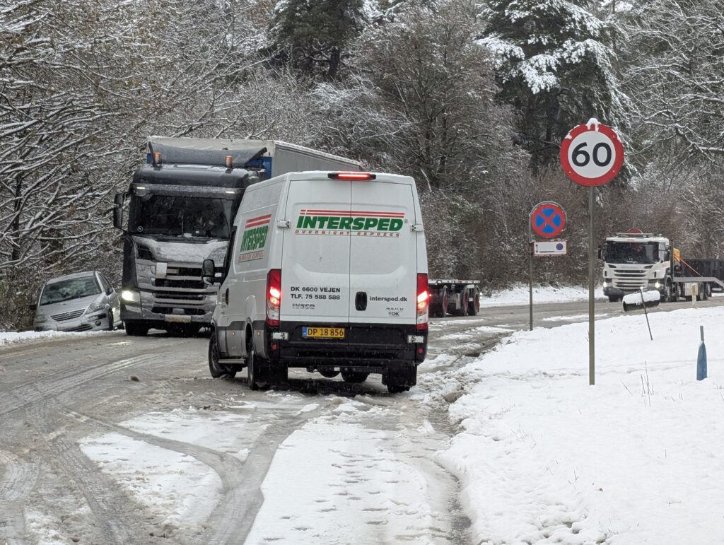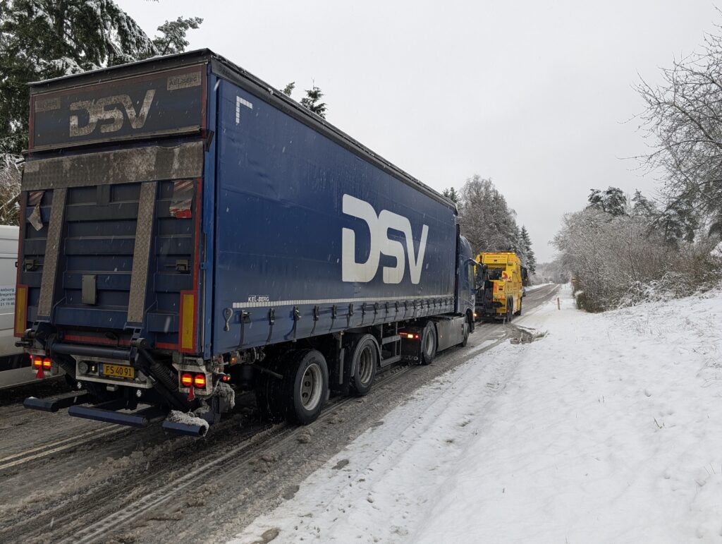 De sne- og isglatte veje skaber store problemer, hvor lastbiler har svært ved at køre op ad bakker. Nu har en lastbil spærret en vej, og det har skabt trafikale udfordringer.