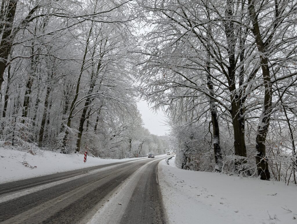 Lastbilen har store problemer med at komme op ad en bakke, fordi der er sneglat, og der har skabt en lang kø på strækningen.