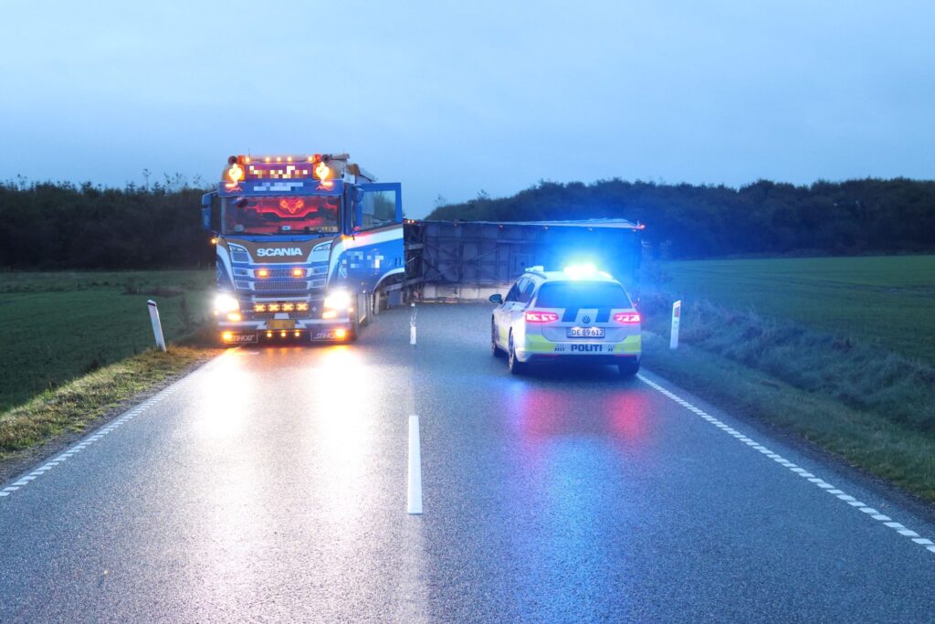 Fredag morgen har en alvorlig ulykke fundet sted, hvor traileren på en lastbil er væltet. Det betyder, at hele vejen nu er blokeret.