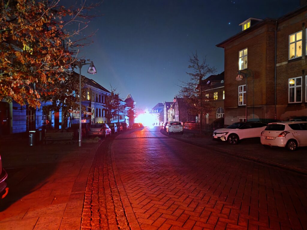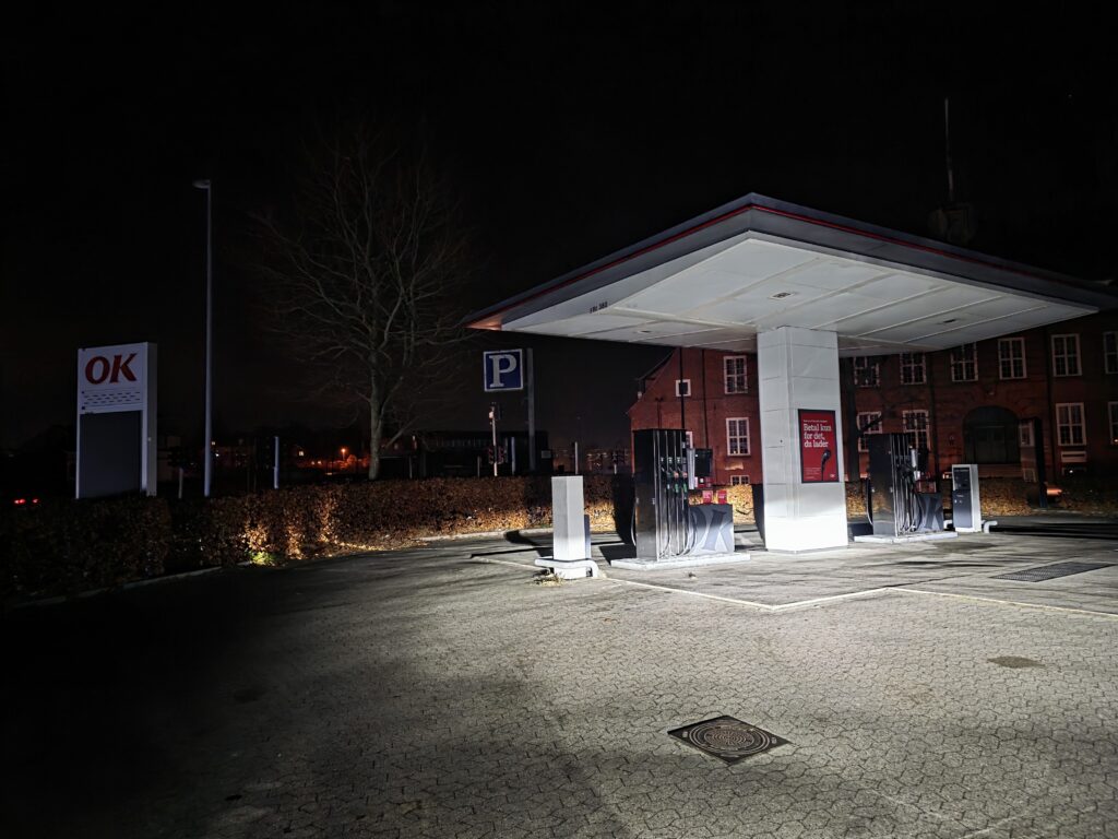 En tankstation er kun oplyst af billygter – se flere billeder nederst i artiklen