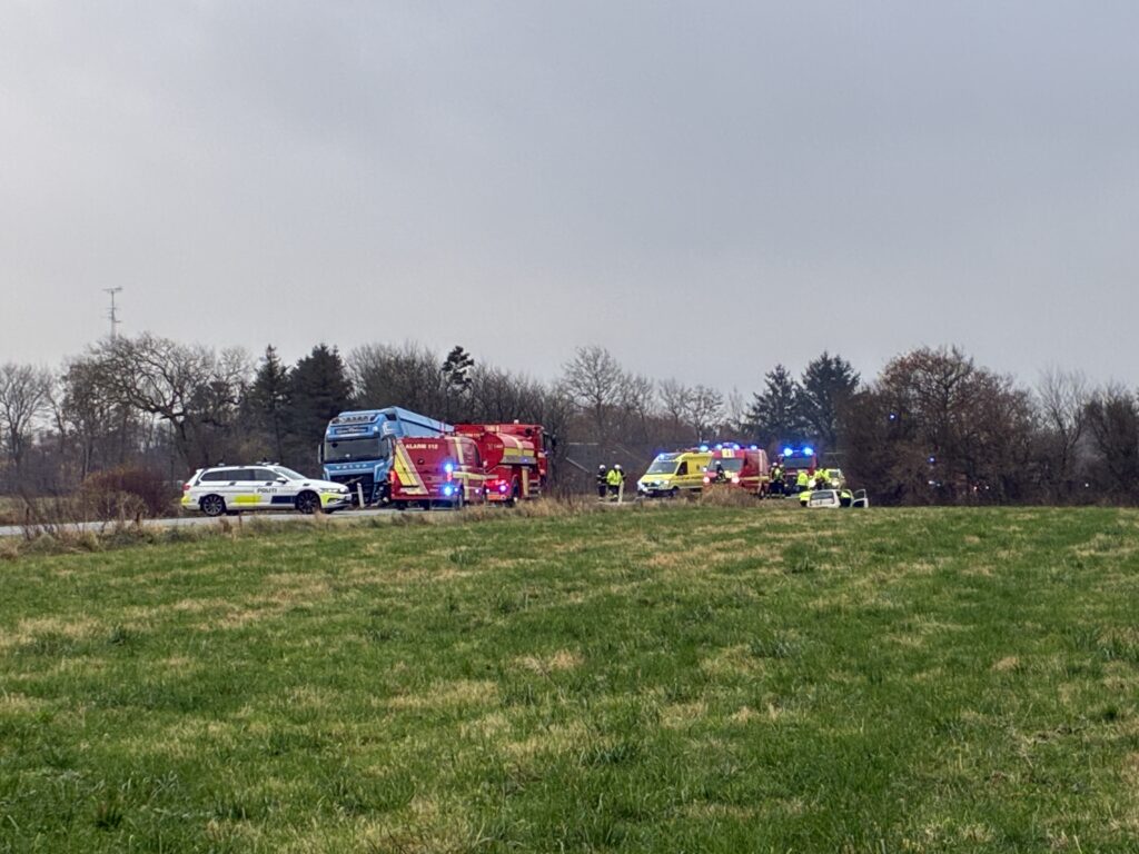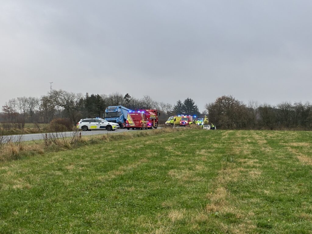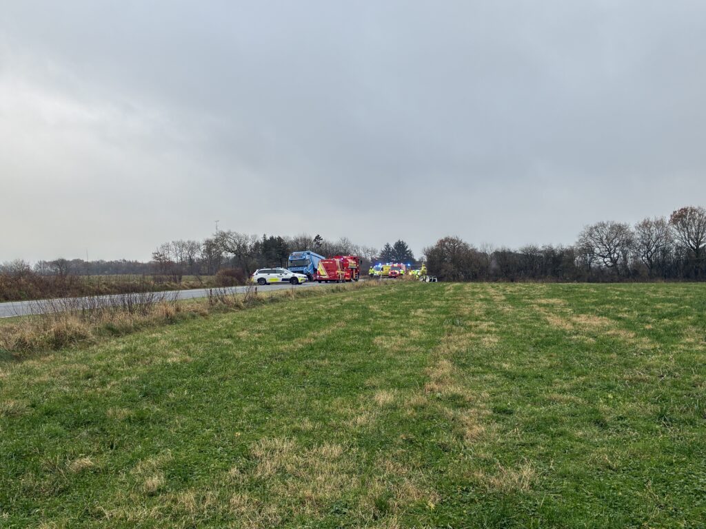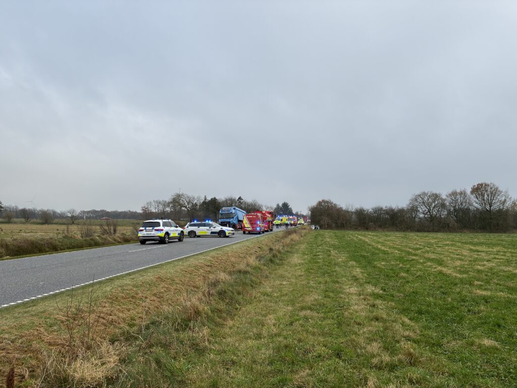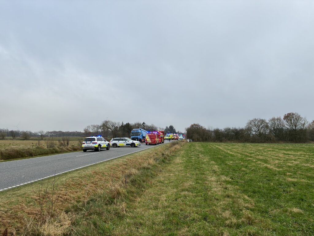 Til ulykkesstedet er der både ankommet patruljevogne, redningskøretøjer, ambulancer og en lægehelikopter, mens personbilen holder på en mark et par meter væk fra vejen.