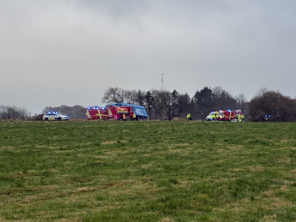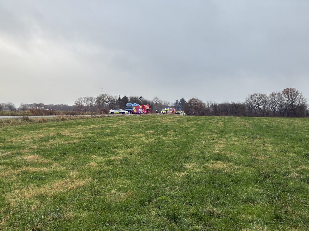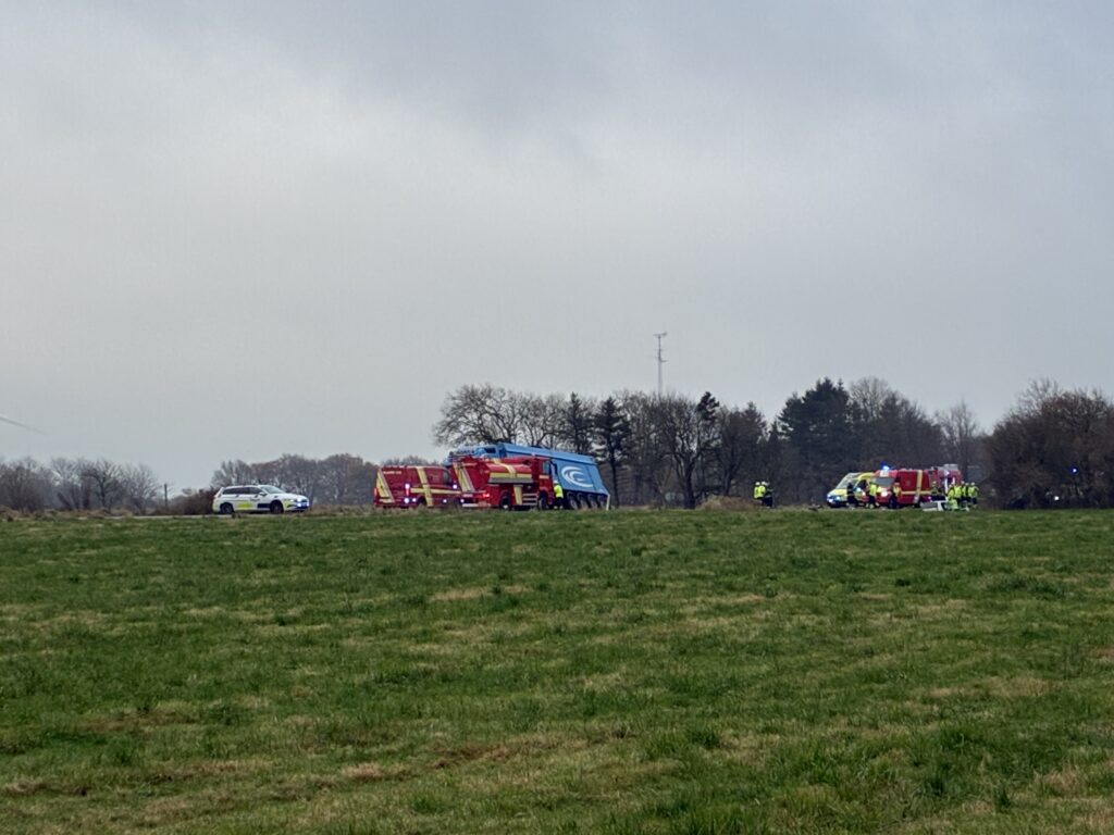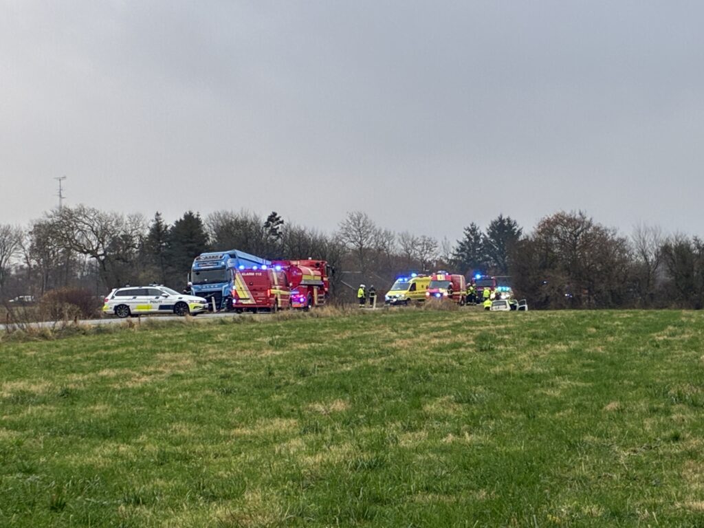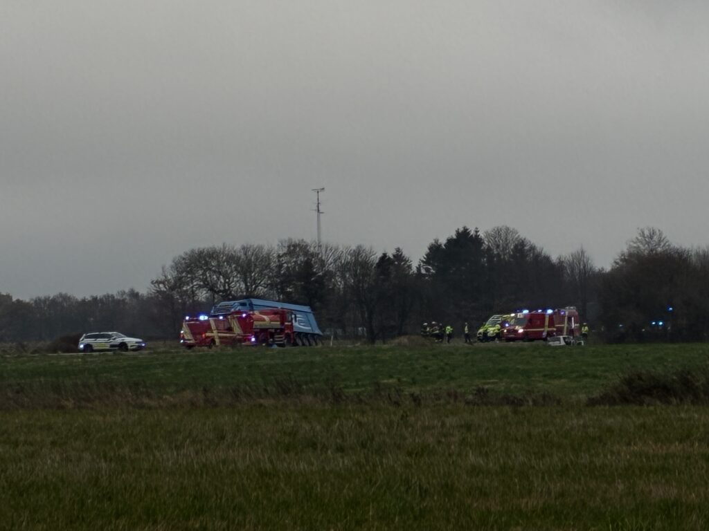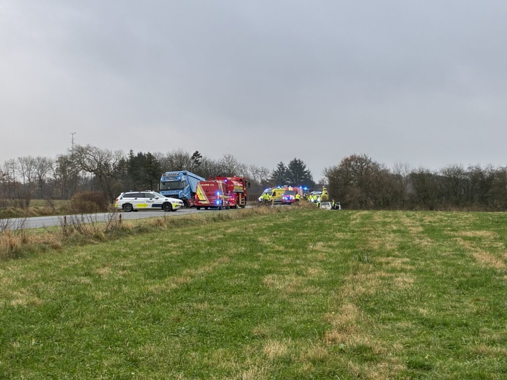 Til ulykkesstedet er der både ankommet patruljevogne, redningskøretøjer, ambulancer og en lægehelikopter, mens personbilen holder på en mark et par meter væk fra vejen.
