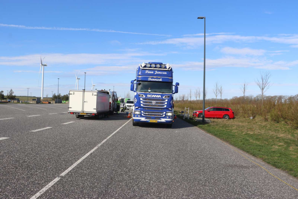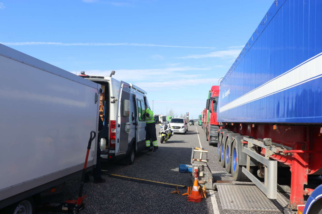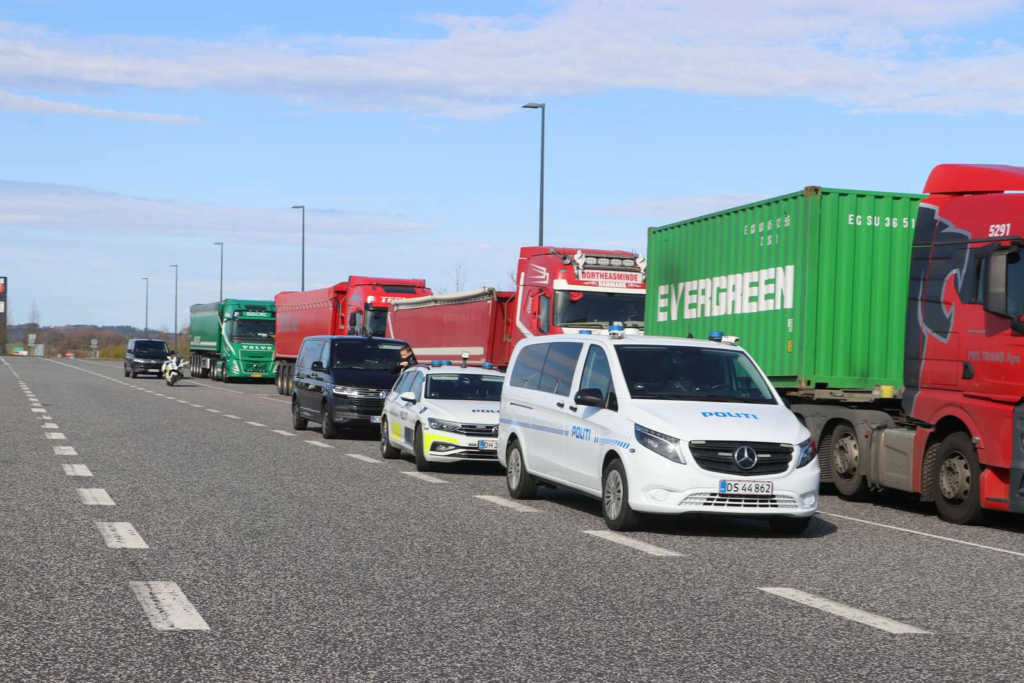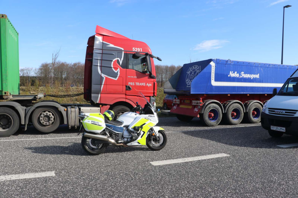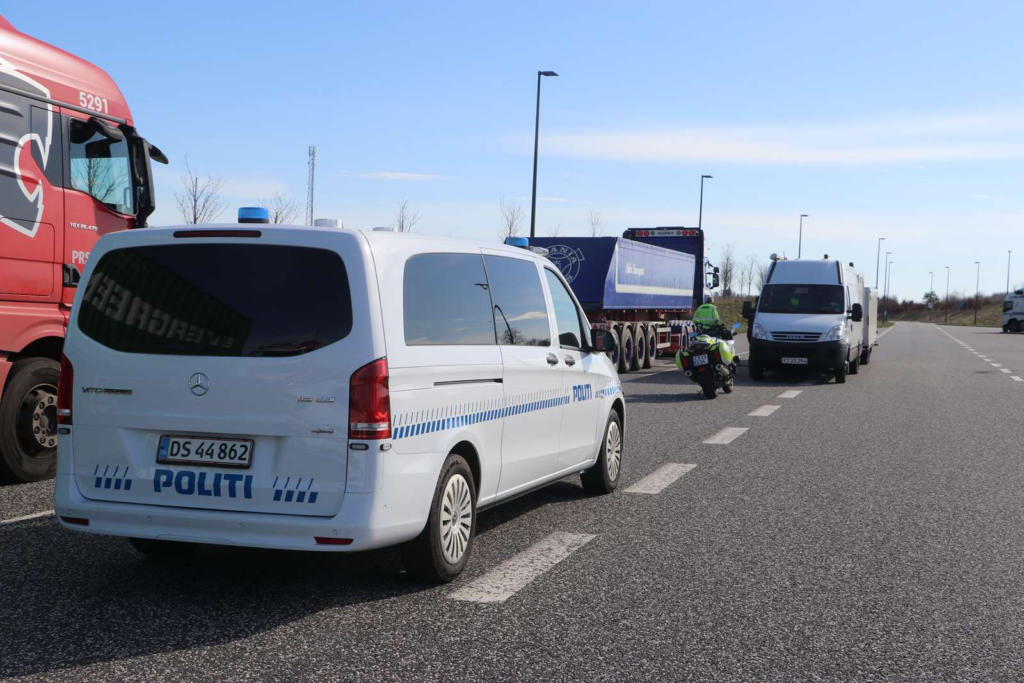 Billeder fra stedet viser, at politiet er til stede med flere køretøjer og har trukket en række lastbiler ind til kontrol.