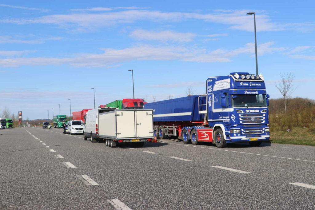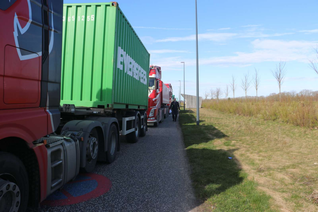 “Betjentene er meget venlige og har fortalt, at de foretager en tungsvognskontrol med fokus på sikkerheden for de store køretøjer. Flere lastbiler holder lige nu i kø for kontrol.”